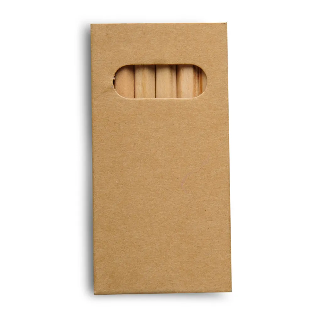Set of 6 wood crayons in cardboard box.