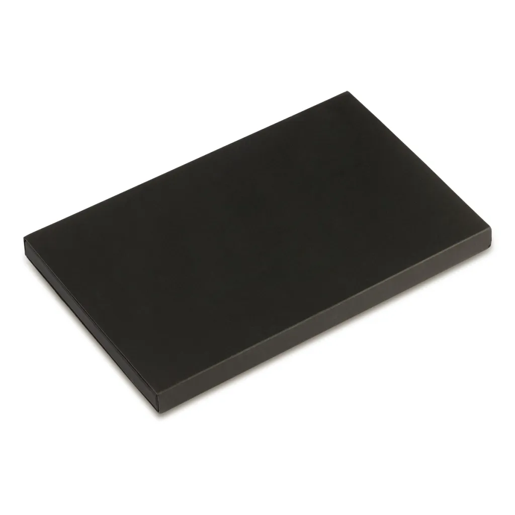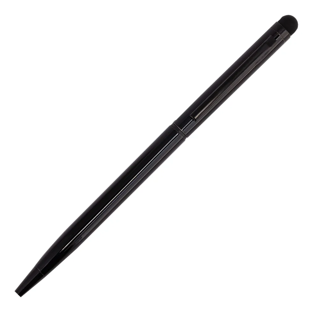 Set with notebook and ballpoint pen in aluminum. The notebook is with a paper leather cover with a ribbon and elastic strap closure. Squared paper (70 g/m², 144 pages). Ballpoint pen with stylus and blue refill. The set comes in a dark box.