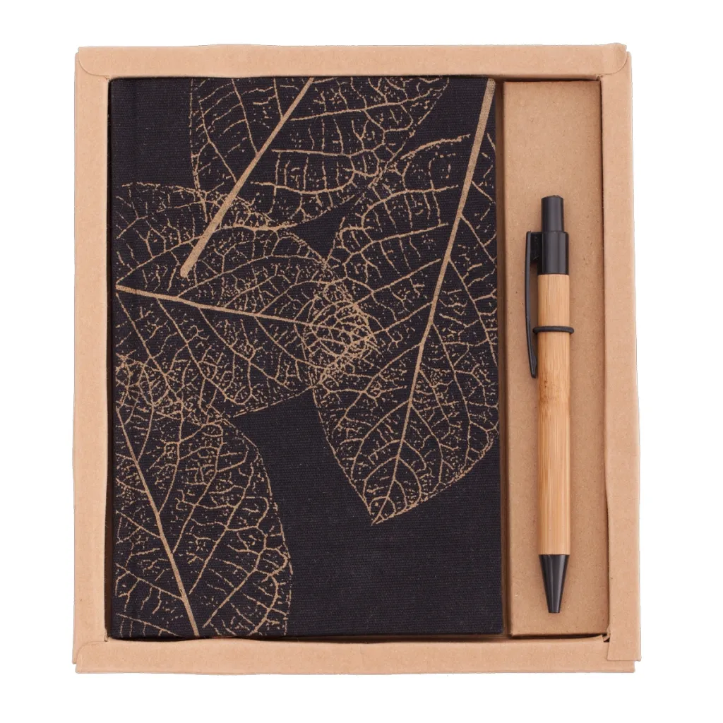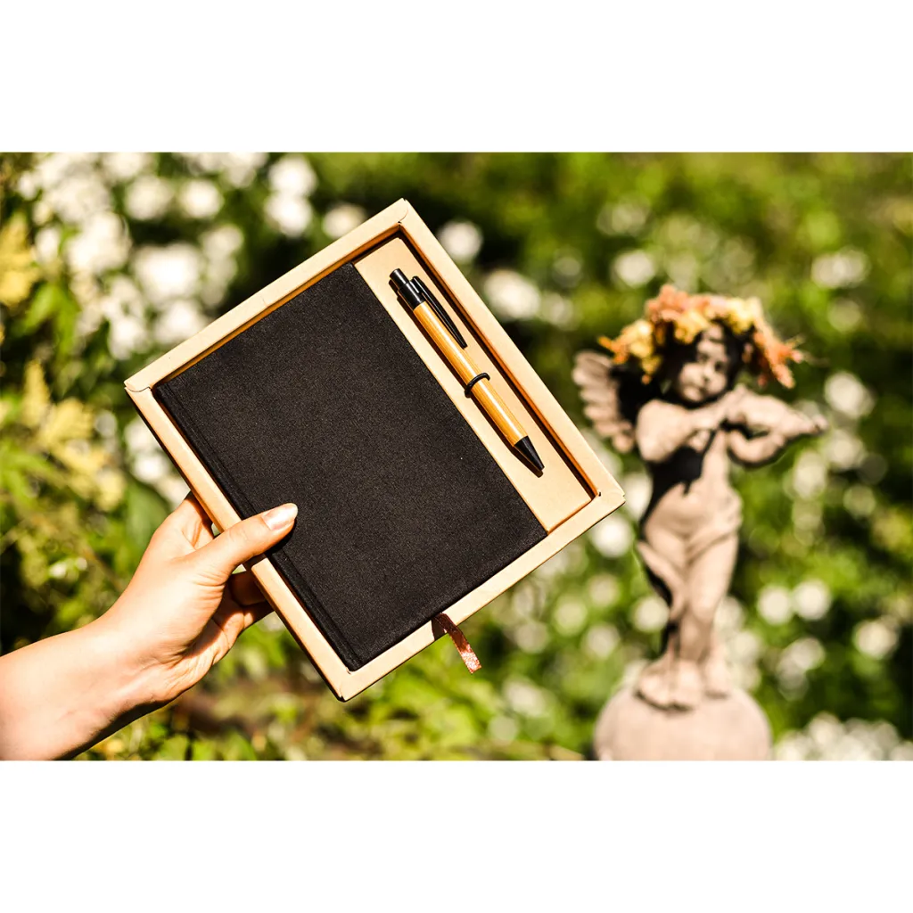 Set with a liner with linen cover and imprinted ballpoint pen and bamboo ballpoint pen with plastic tip. Blueprint (80 g / m2, 180 pages). The set is packed in a gift box.