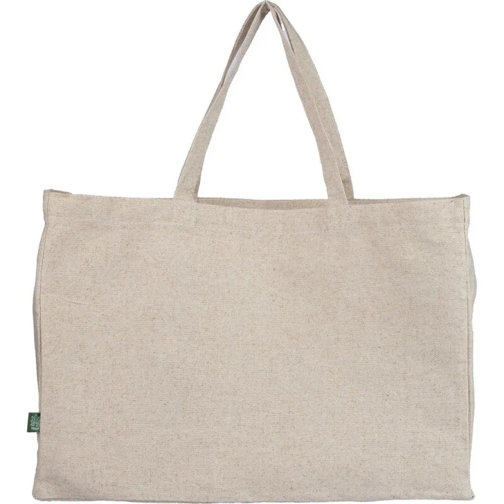 Shopping bag, short handles, comfortable tote with large capacity, includes hemp icon on tag, product made from hemp.