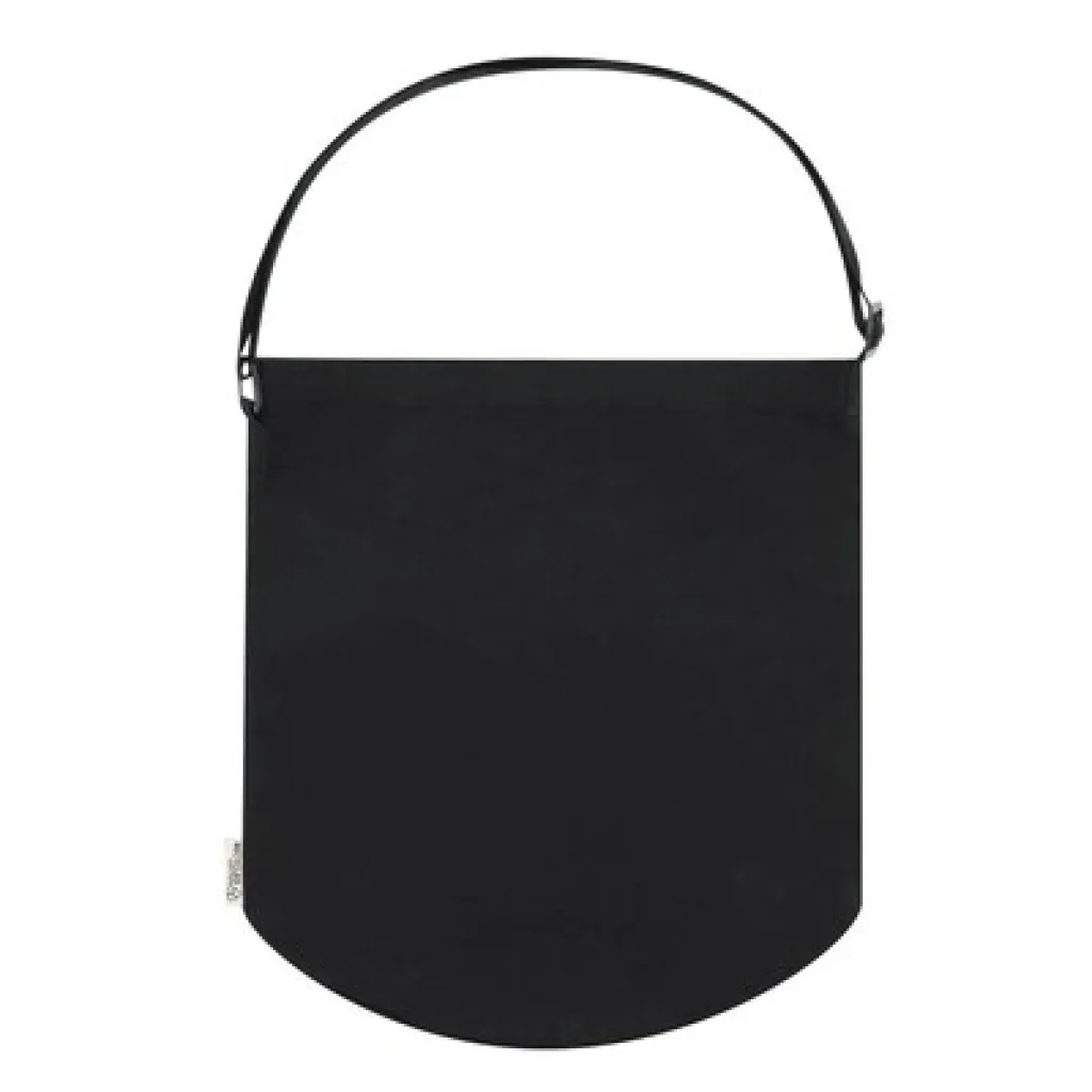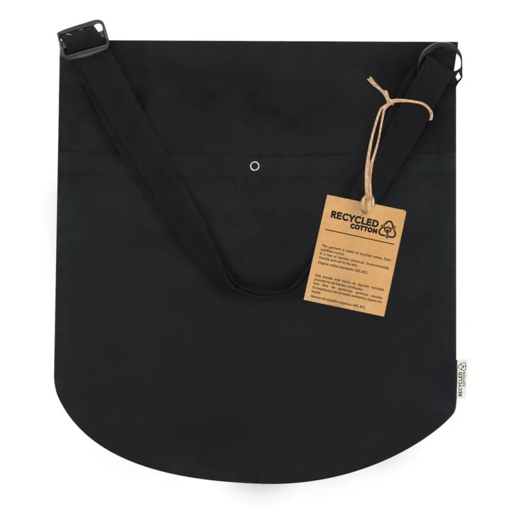 Shoulder bag with large capacity, features a main compartment, internal and external pocket, adjustable shoulder strap, includes recycled cotton icon on tag, product made from recycled canvas.