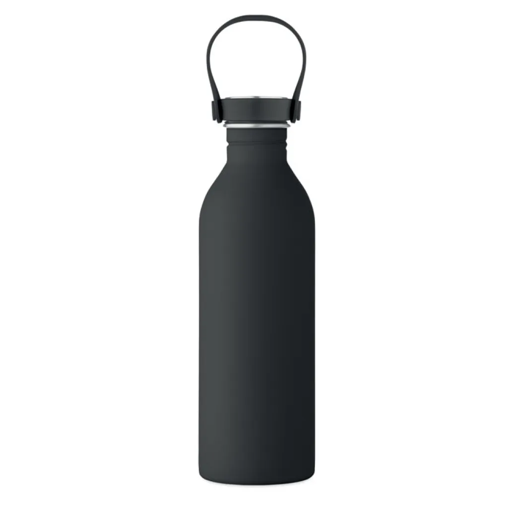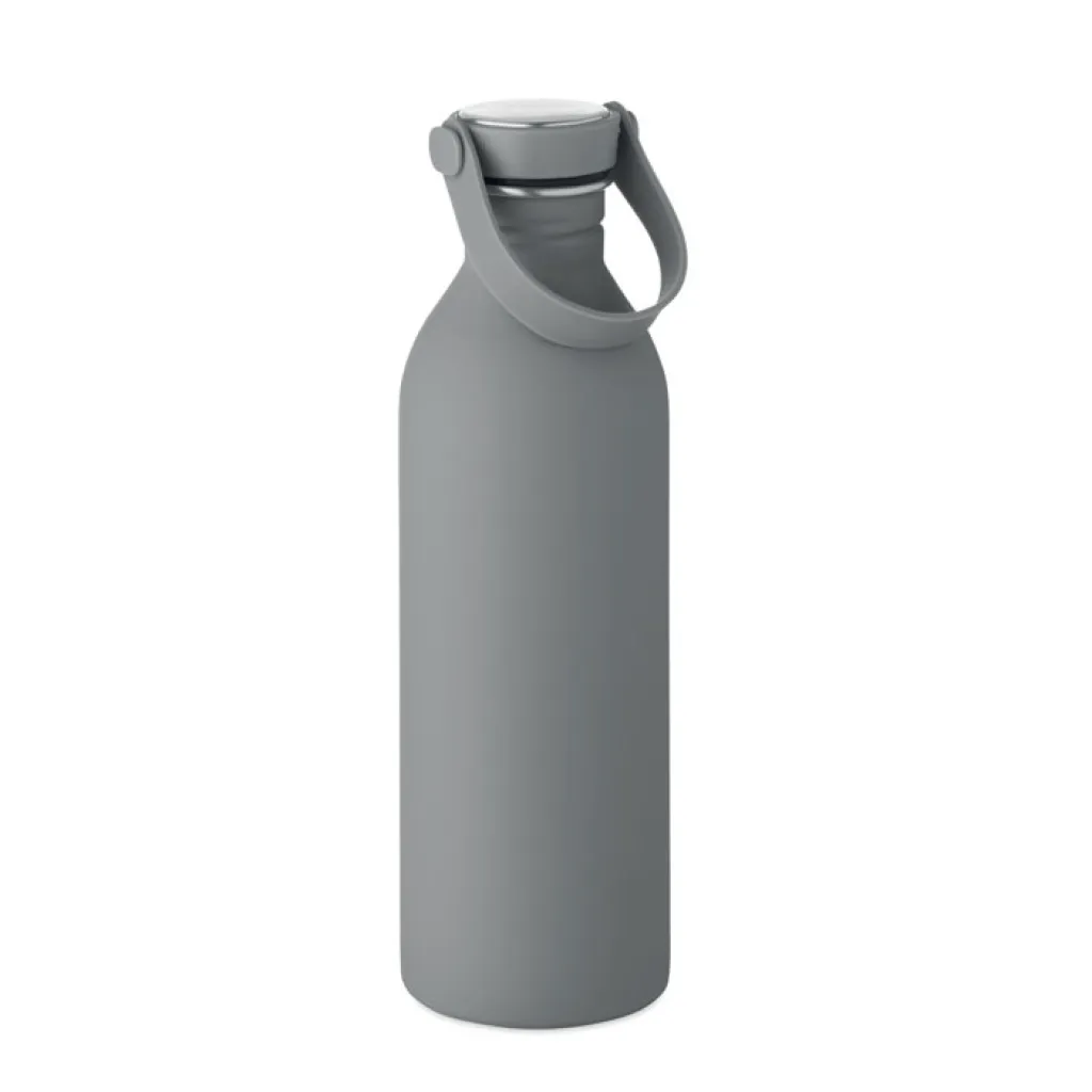 Single wall bottle made of 90 % recycled stainless steel and 10% stainless steel with rubber finish. Includes PP and SS lid with silicone handle. Capacity: 500 ml.