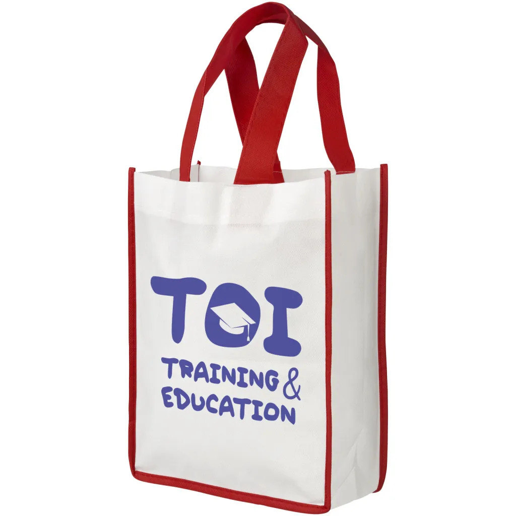 A shopping bag made from white non-woven PP material with coloured handles and edging. Fresh and colourful design. Compact and convenient version of the Contrast Shopper.