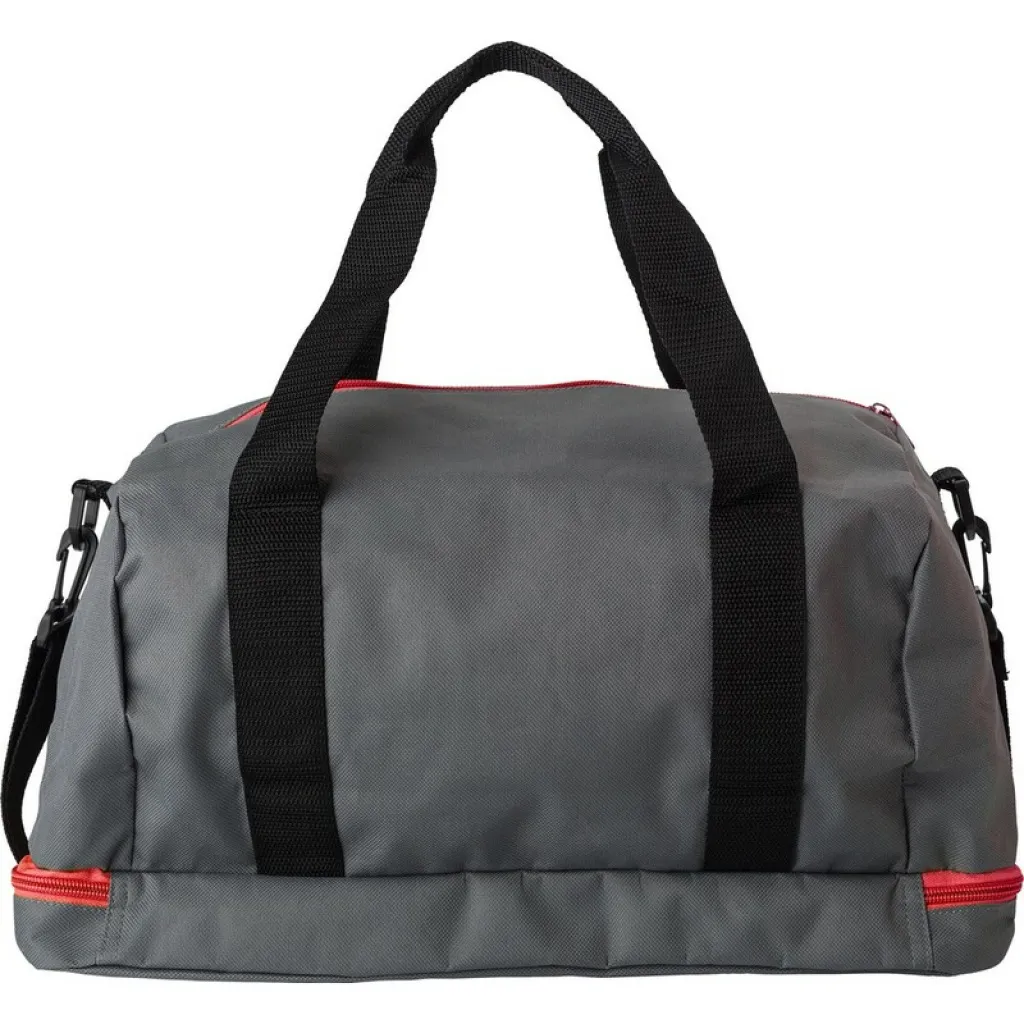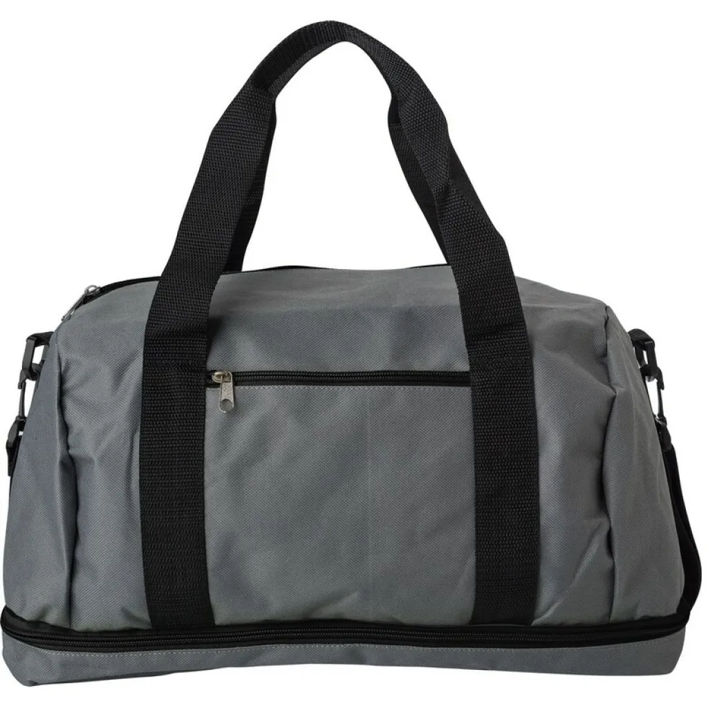 Small sports, travel bag with zipped front pocket, shoe compartment, handles and adjustable shoulder strap