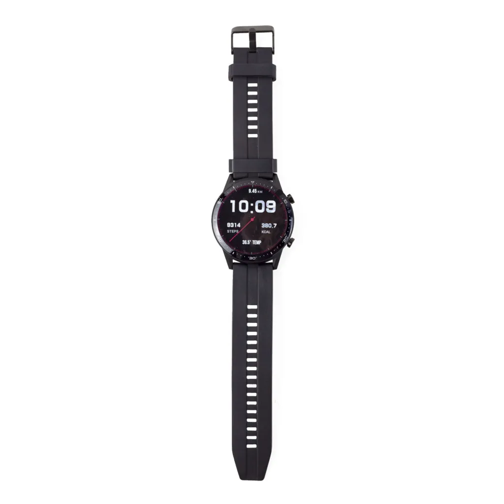 Smartwatch with body temperature thermometer and 1.3 inch touch screen and integrated camera. Tracks daily physical activity and has a multisport mode. Battery 3.7V / 240 mAh. RAM 128 kB / ROM 64 Mb.
