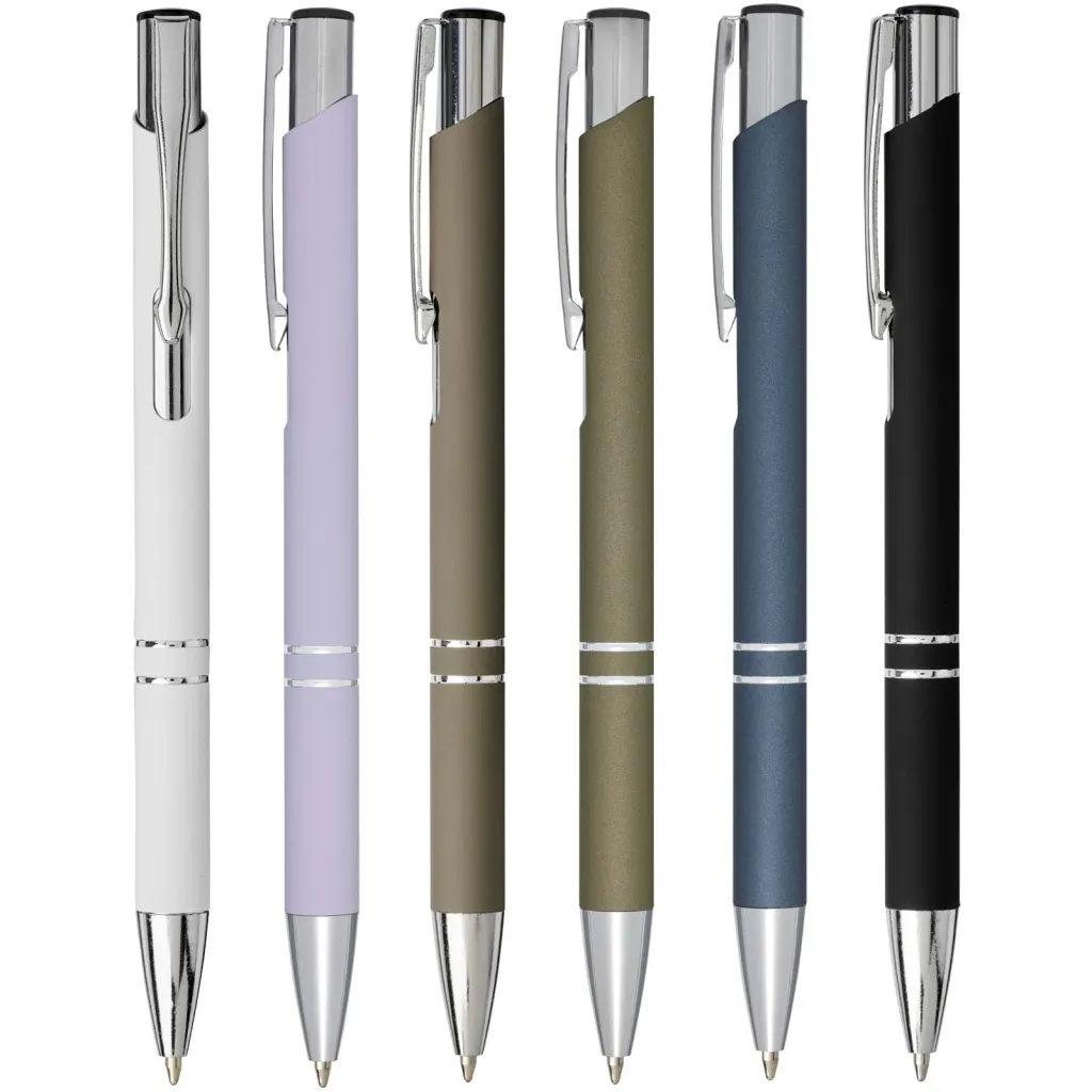 Stylish click action mechanism aluminium ballpoint pen with soft-touch coating. When laser engraved the shiny chrome underlayer of the pen will appear. The extensive and popular Moneta range is available in many different styles and finishes.