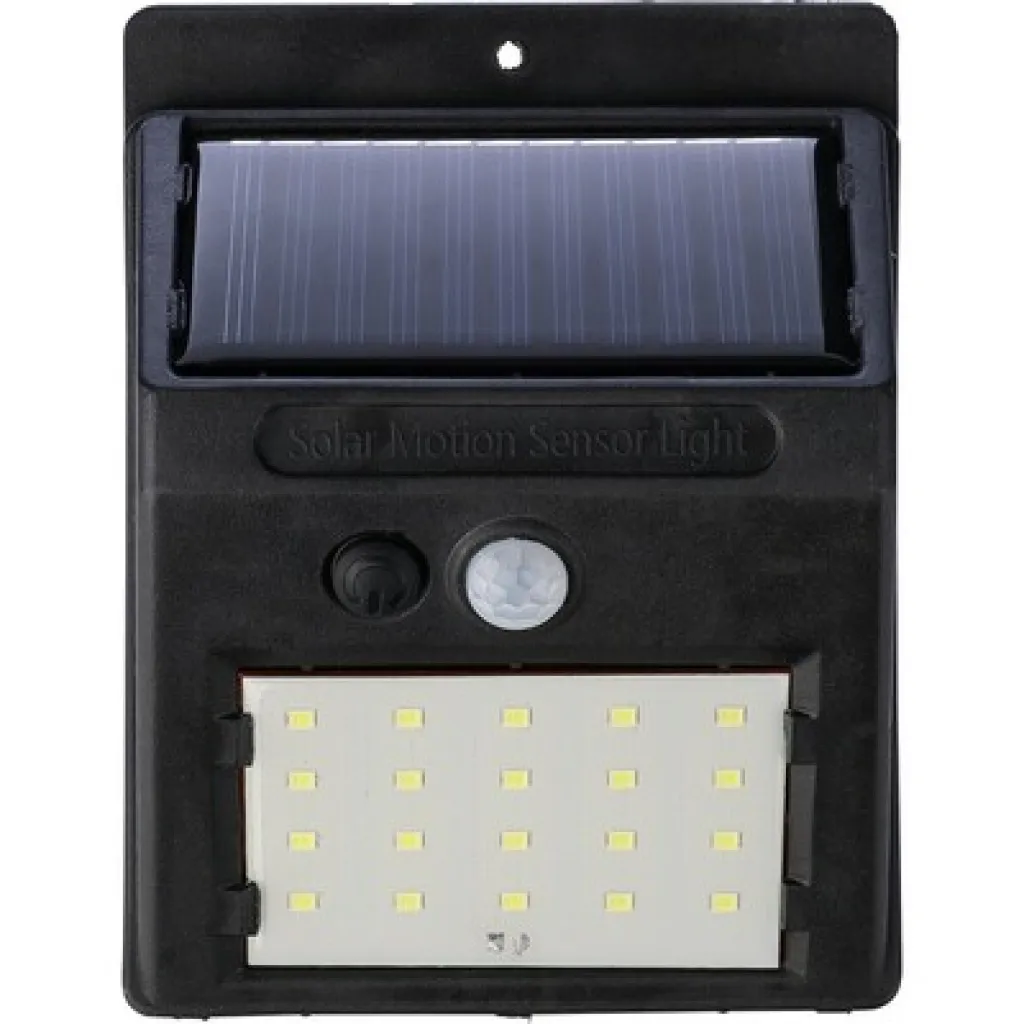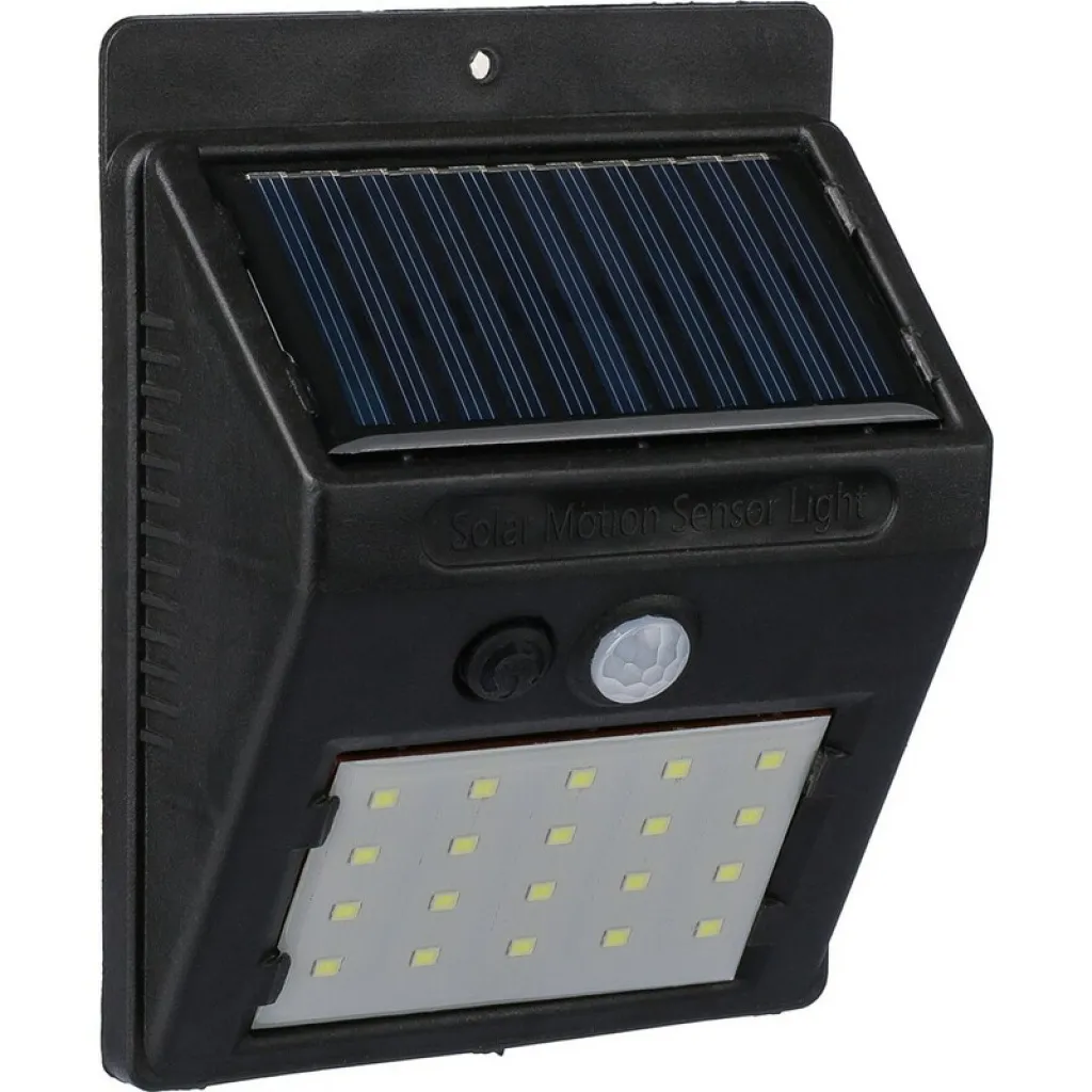 Solar power wall light with 20-COB LED, features a night sensor (CDS) and motion sensor (PIR), includes an 800 mAh battery capacity, includes a charging cable, IP44 rating, constant or flashing light functions, individually packaged in a brown cardboard box, product made from PP
