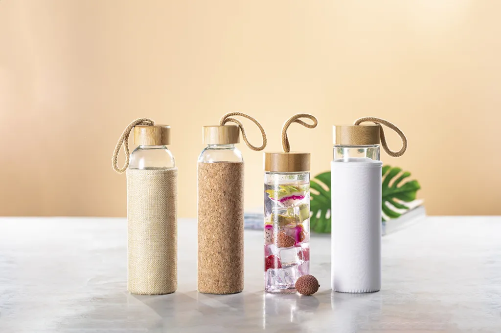 Glass sport bottle with natural cork cover, bamboo lid and carry strap, 500 ml.