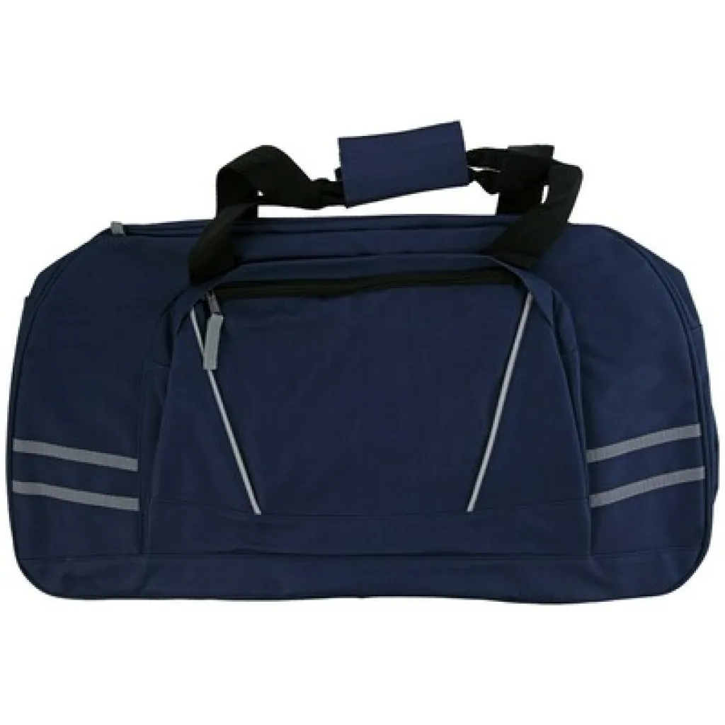 Sports, travel bag with large front pocket and reflective stripes, adjustable shoulder strap