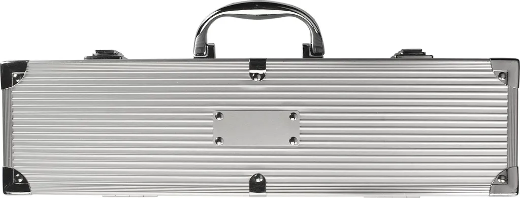 Stainless steel, three-piece barbecue set in an aluminium case, including: spatula, fork and tongs.