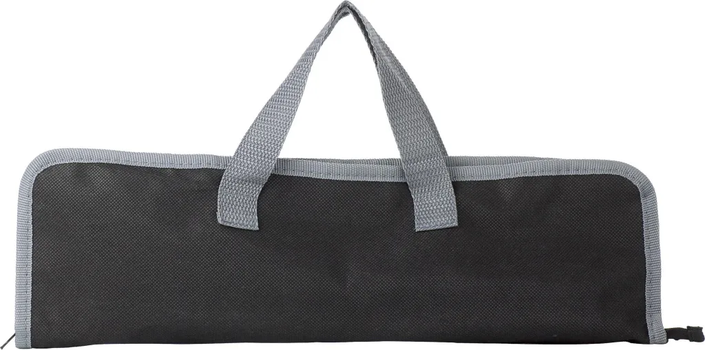 Stainless steel, three-piece barbecue tool set in nonwoven carry pouch. Including: a spatula, tongs and fork.