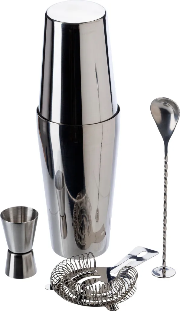 Stainless steel (s/s304) cocktail set. Including shaker (750 ml), measure cup (30 ml), spoon, and sieve. Packed in cotton pouch.