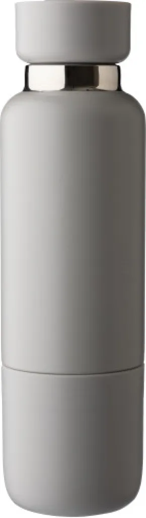 Stainless steel vacuum double-walled drinking bottle (500 ml) with a PP drinking cup (300 ml) on the bottom. The inside is stainless steel 304, the outside stainless steel 201. PP lid with AS transparent closing, featuring a polyester wrist cord and carrying strap. Matte colors. Individually packaged in a brown carton box.