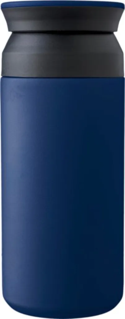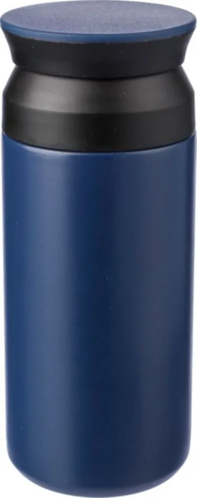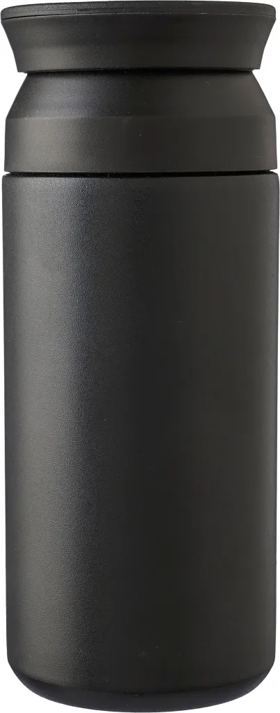 Stainless steel double-walled vacuum drinking mug (350 ml) with flat PP lid. Matt lacquered. The interior is made of stainless steel 304, and the exterior is stainless steel 201. Stress-free PP drinking opening mechanism. Keeps contents hot for 12 hours and cold for 18 hours. Individually packaged in a brown cardboard gift box.