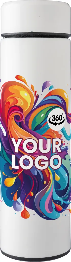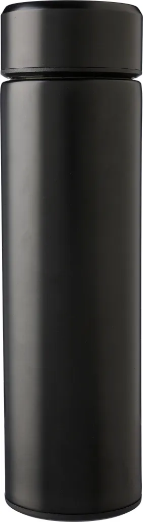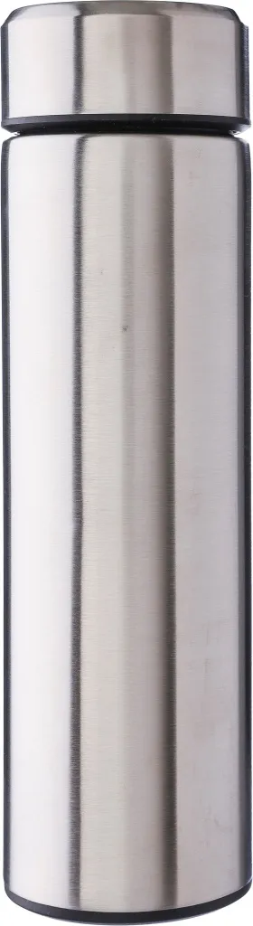 Stainless steel double-walled drinking bottle (425 ml) with a built-in, removable tea sieve. The interior is made of stainless steel 304, and the exterior is stainless steel 201. Individually packaged in a brown cardboard box.