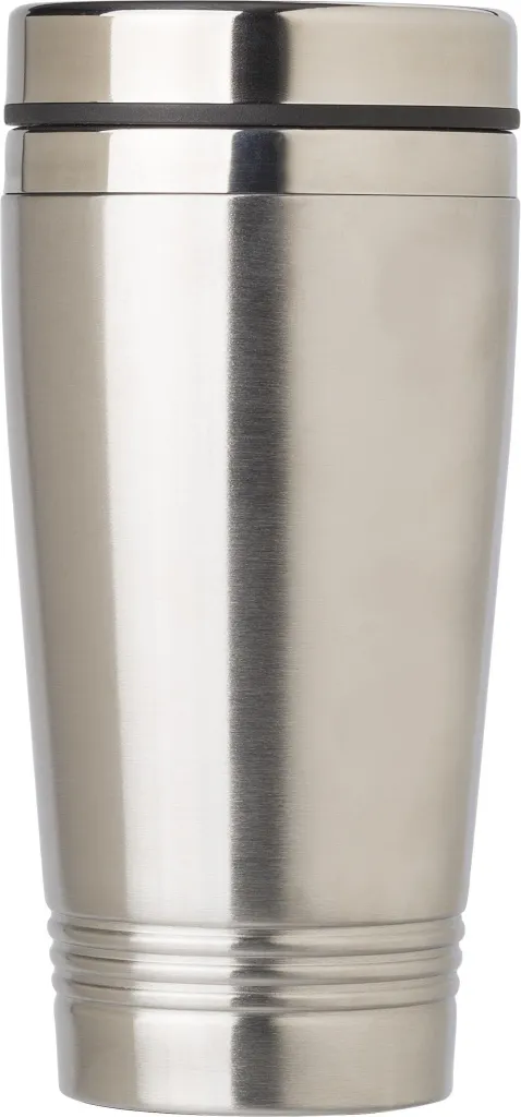 Stainless steel drinking mug (450 ml) with lid. Suitable for hot content up to 70 degrees Celsius. Lid has a sliding opening for drinking. Anti-slip bottom. Individually packaged in a brown cardboard box.