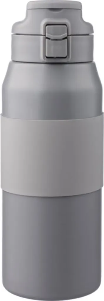 Stainless steel double-walled drinking bottle (800 ml) with a silicone grip on the body, straw, PP lid, and carrying handle. Made of 304 stainless steel. Push button to open or close the spout. Keeps contents hot for 8 hours and cold for 12 hours. Individually packaged in a brown cardboard box.