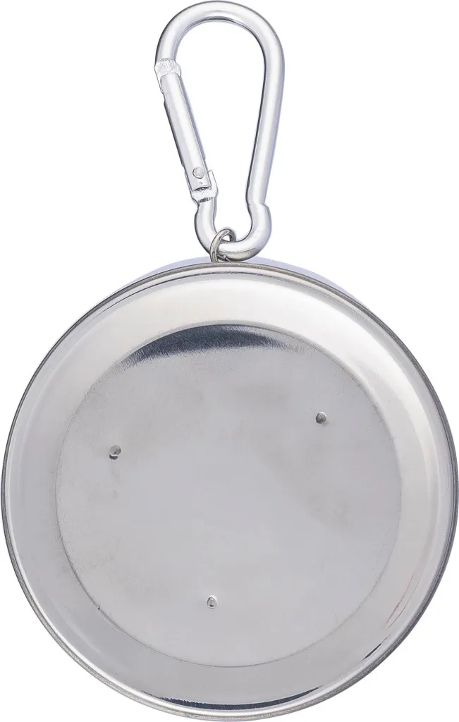 Stainless steel foldable cup (220 ml) with a metal carabiner. Individually packaged in a brown cardboard box.