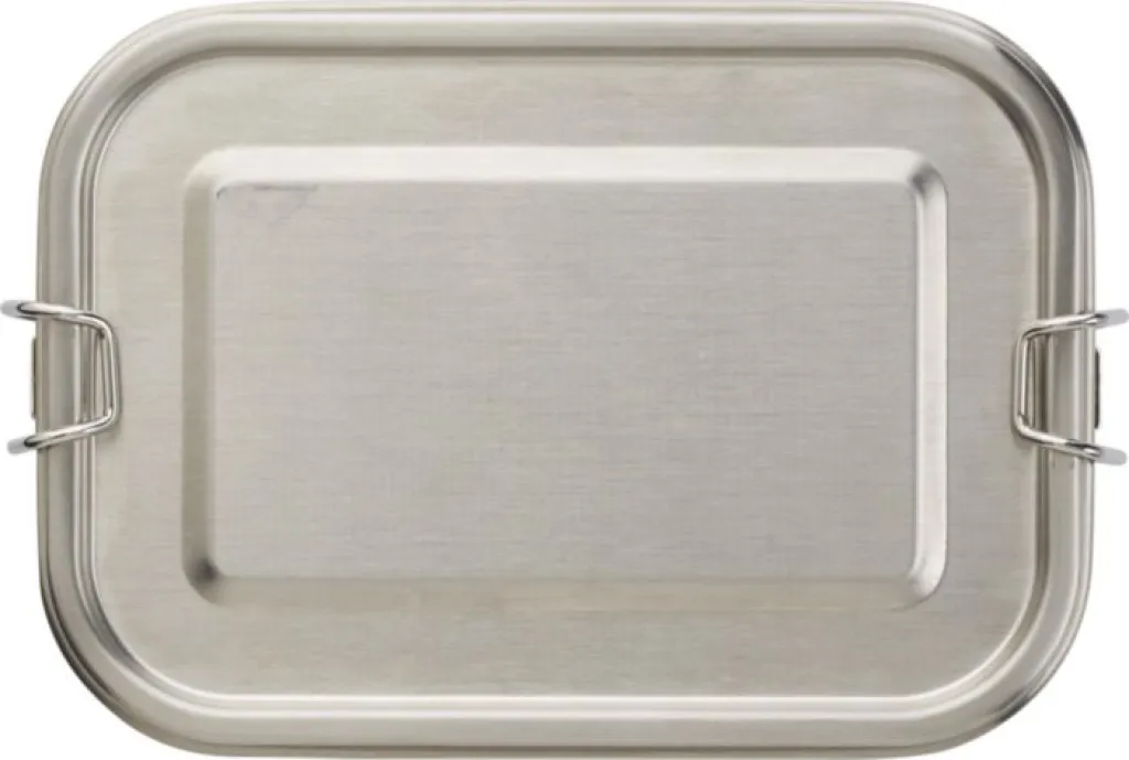 Stainless steel (s/s304) lunch box (750 ml) with buckle closing. Individually packaged in a brown cardboard box.