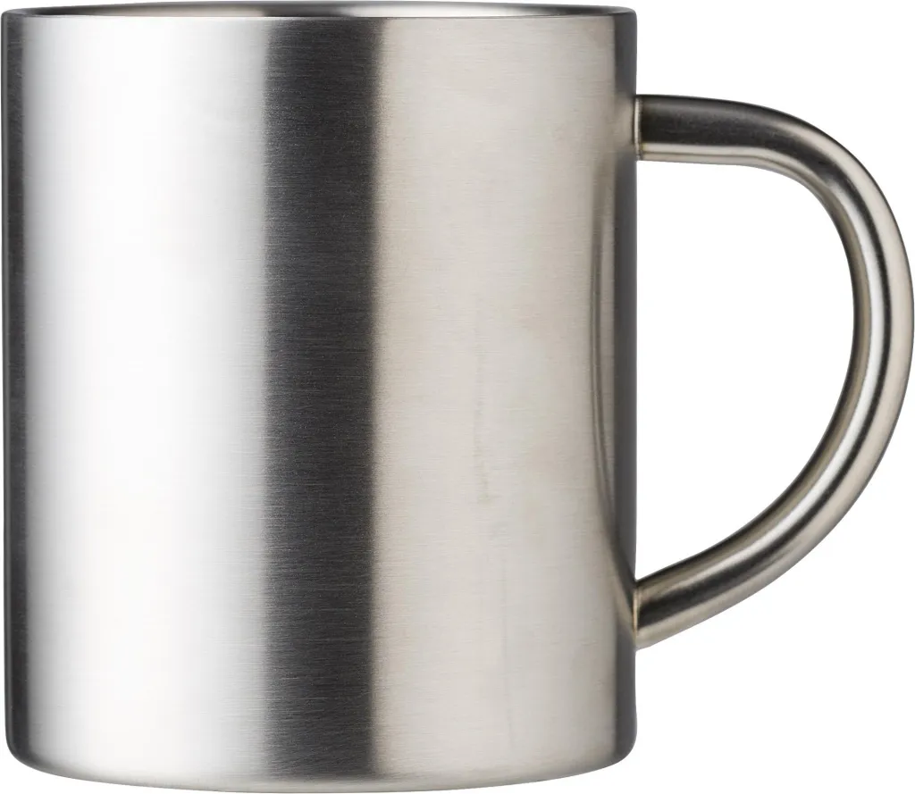 Stainless steel (s/s304) mug (250 ml). Inside is 304 stainless steel, outside is 201 stainless steel. Individually packaged in a cardboard box.