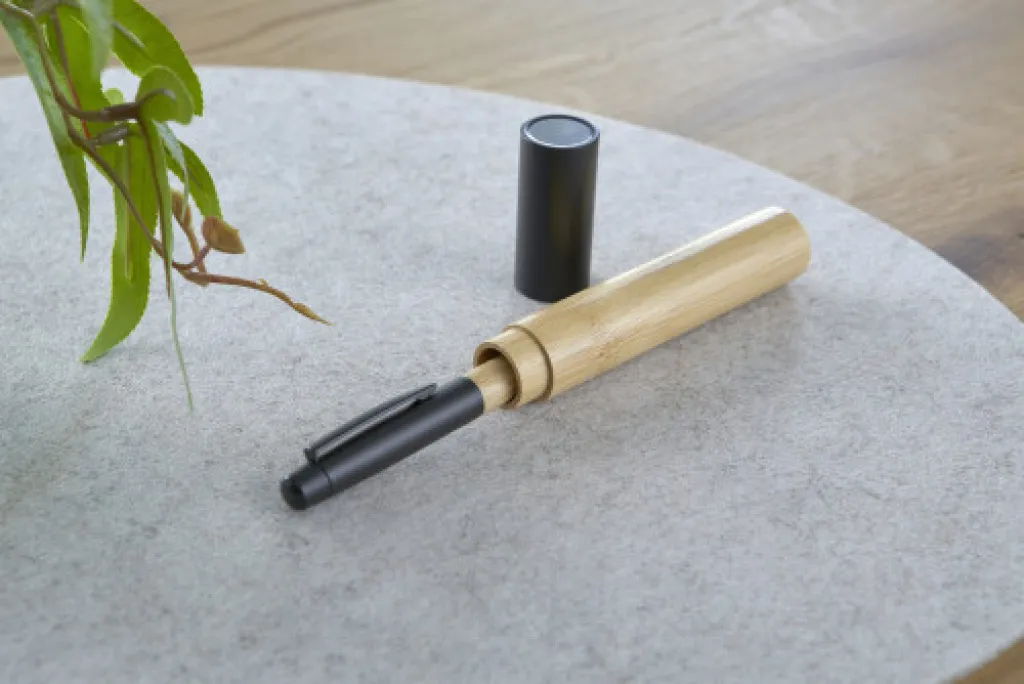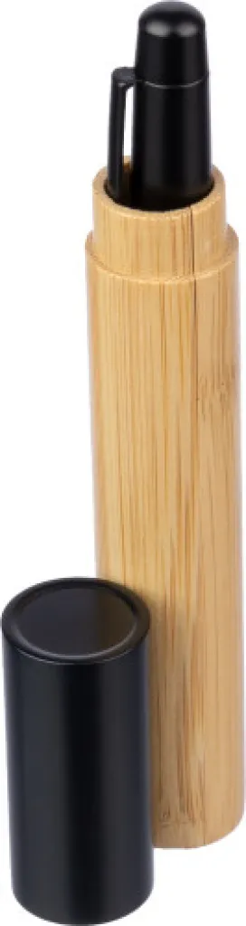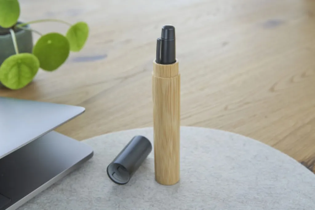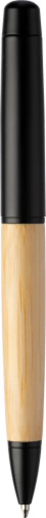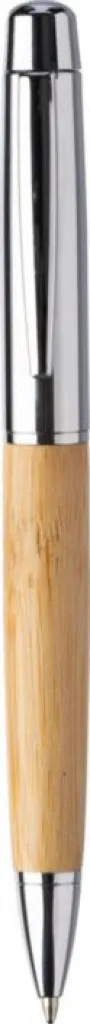 Stainless steel twist ballpen with bamboo grip in a bamboo and aluminum tube. Includes metal Parker blue refill. Individually packaged in a brown carton box.