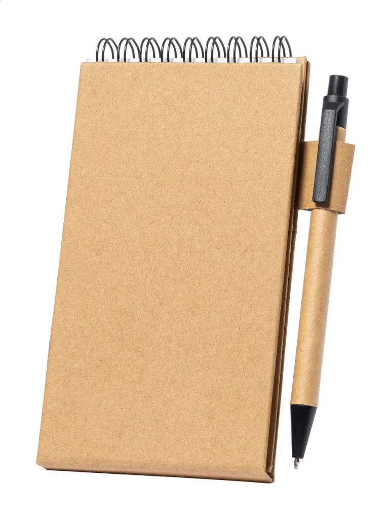 Recycled paper covered spiral notepad with 30 lined sheets, 25 sticky notes and 125 page markers (in 5 different colours). With mobile phone holder function. Including recycled paper ballpoint pen with blue refill.