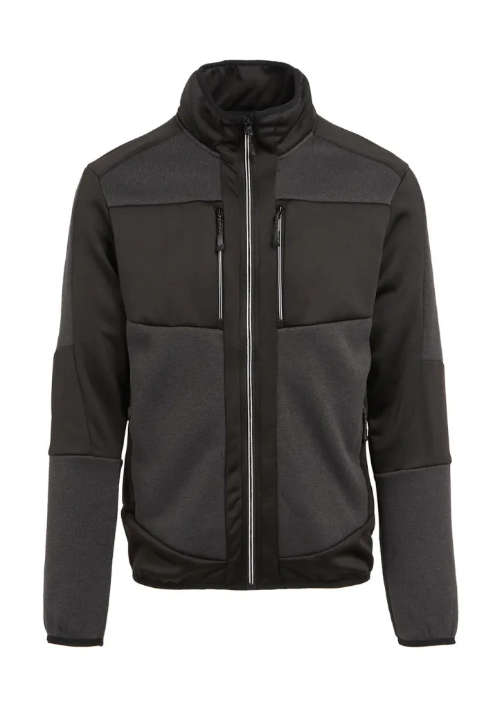 ·235 g/m² ·100% Polyester (stretch fabric); partly recycled ·Inserts: 100% Polyester (knit fabric) ·Extol Stretch warm backed knitted fabric ·Stand up collar ·Stretch binding to collar, cuffs and hem ·Set-in sleeves ·Full zip with chin guard and reflective piping ·Side pockets with zip ·Zipped chest pockets with reflective piping ·Reflective print detail ·Chest area space for decoration ·Made using recycled materials.