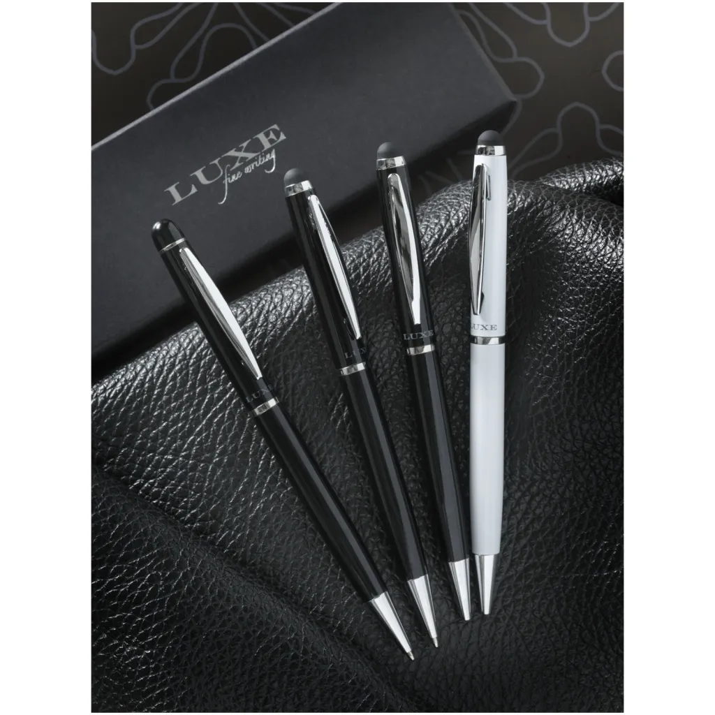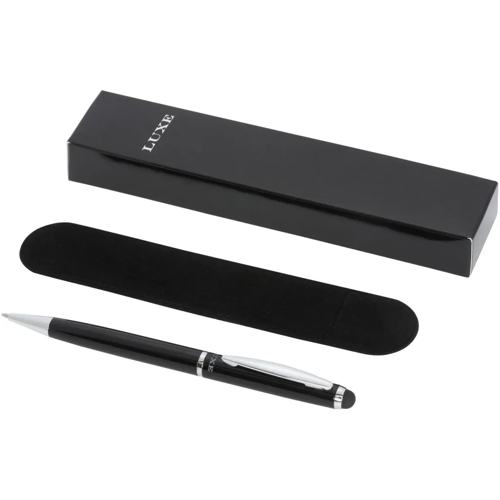 Exclusively designed twist action mechanism stylus ballpoint pen with velvet pouch. Packed in a ''LUXE'' gift box (size: 17 x 3.5 x 2cm).