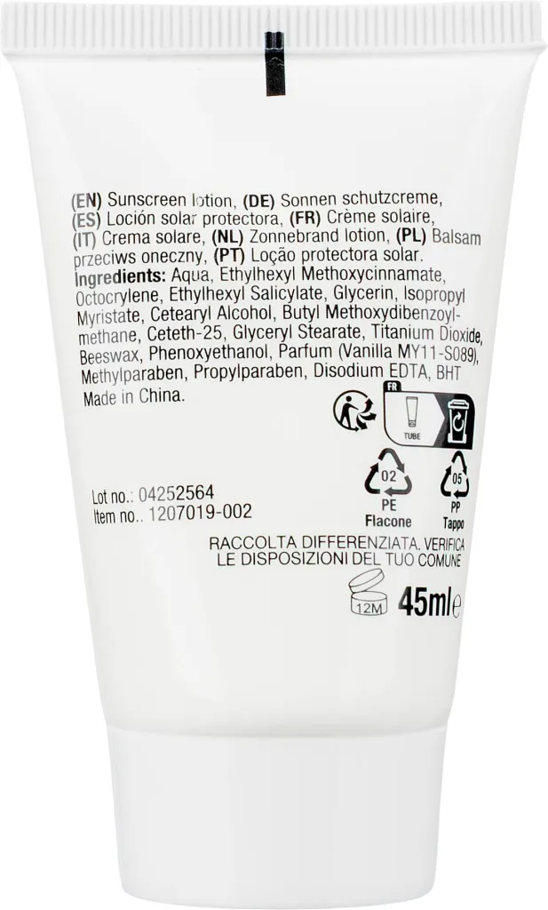 PE sunscreen tube filled with 45 ml of SPF30 vanilla-scented sunscreen. Dermatologically tested and has a shelf life of up to 3 years after the production date.