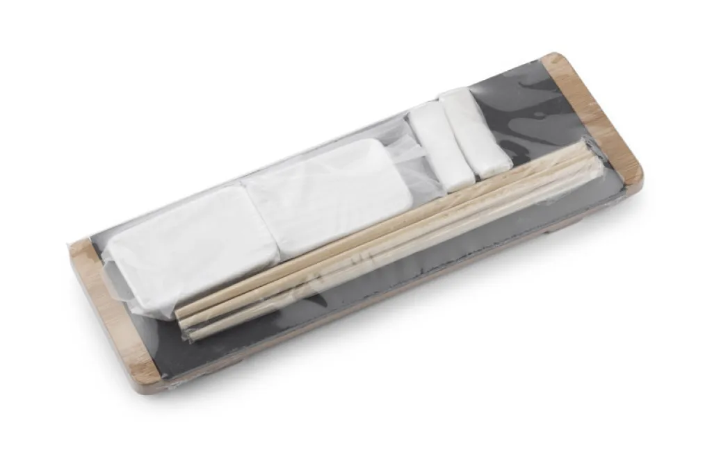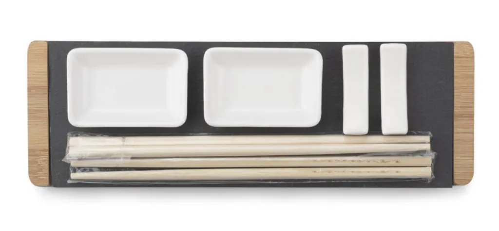A sushi set is a great idea for a gift. The set includes a bamboo pad on which a stone board is placed, bamboo sticks with stands and bowls for the sauce. Set for two people. Will please every sushi lover.
