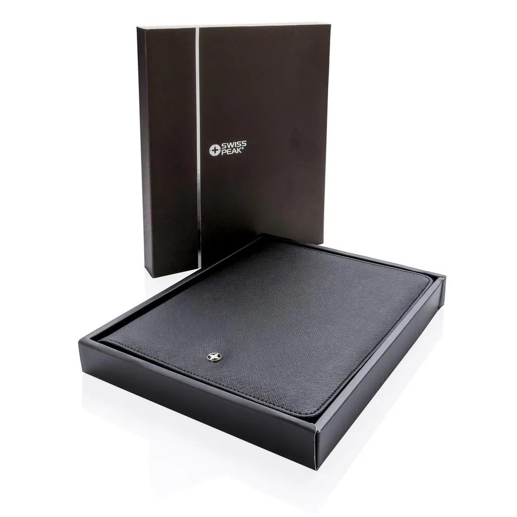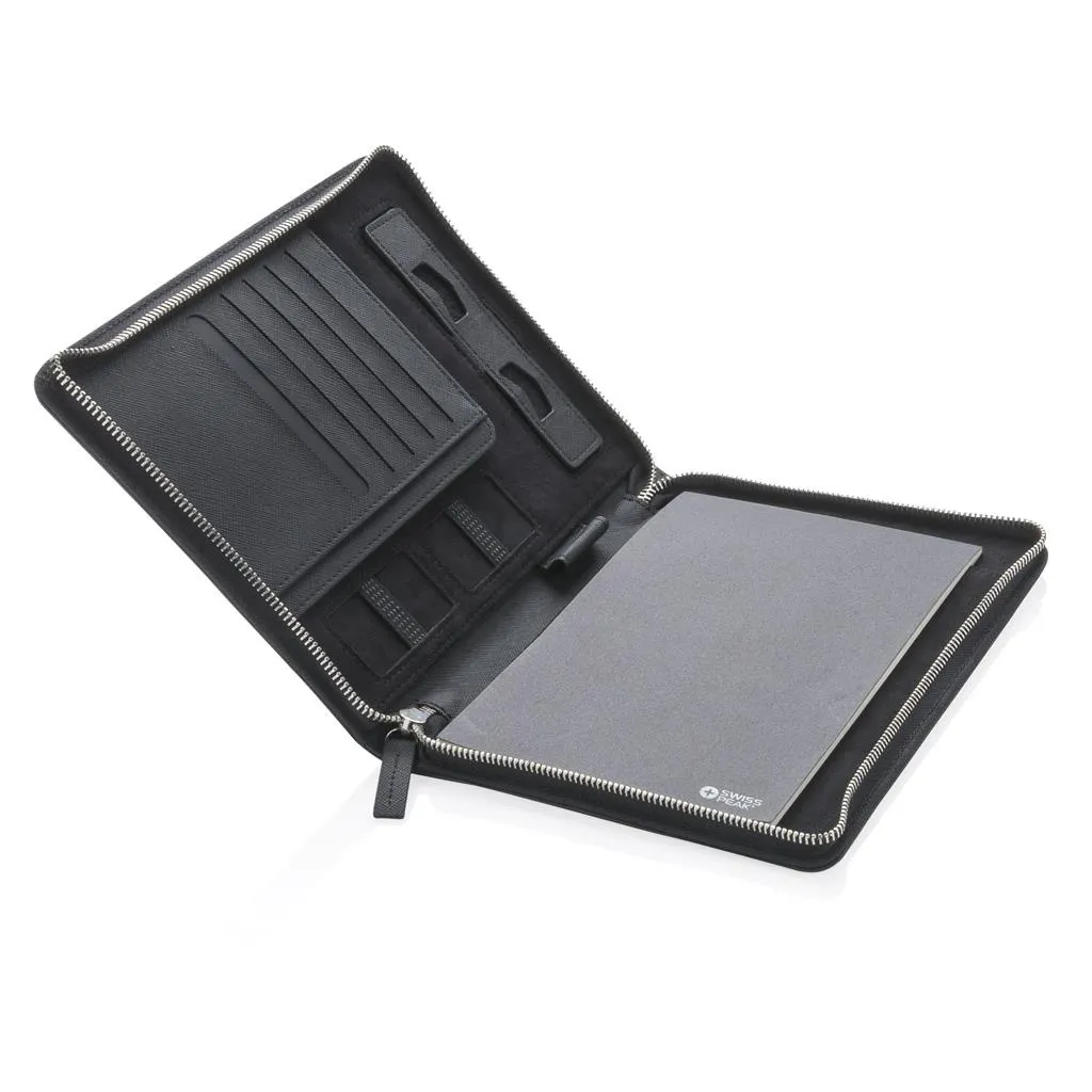 The Swiss Peak Heritage collection speaks the language of modern elegance. Comes with iconic Italian PU cover with luxury silver zipper. The inside provides a phone stand, gadget holders, business cards slots, sleeves for your notes and papers. With A5 notepad.
