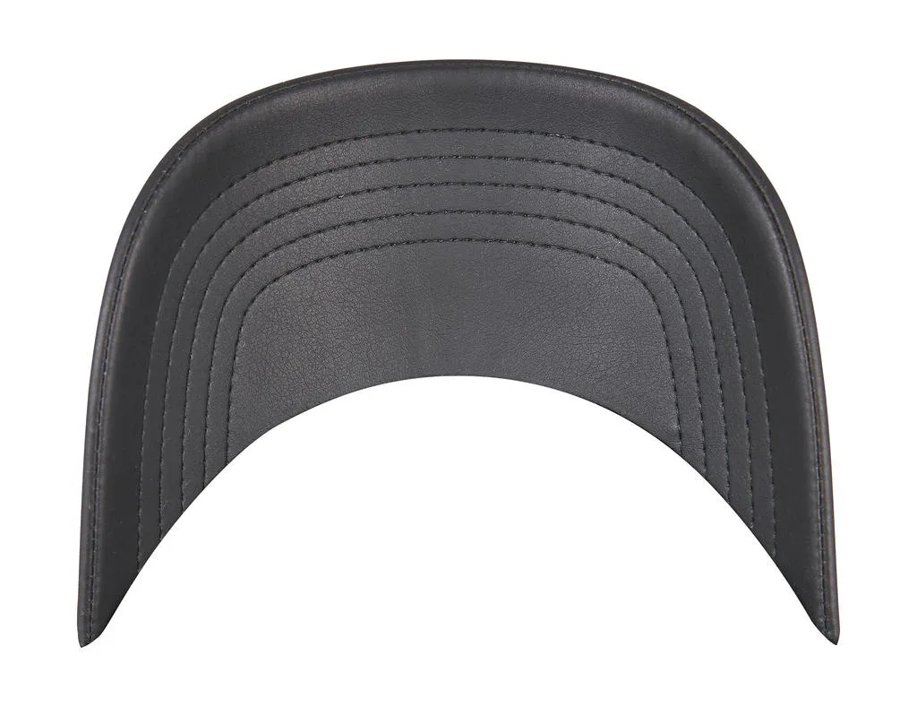 ·225 g/m² ·100% Polyurethane (Synthetic Leather) ·Long life fabric ·6 panels ·Peak with 5 rows of stitching ·Matching undervisor ·Precurved peak ·Self fabric size adjuster with metal buckle.