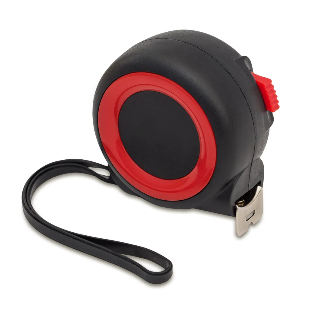 5 m tape measure made from carbon steel and ABS. Cm & inch scale. It comes with a belt clip.