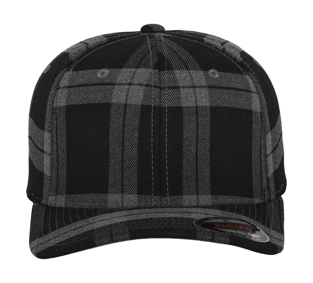 ·330 g/m² ·64% Polyester, 34% Viscose, 2% Elastane ·Modern check pattern ·Hard buckram ·Silver colored undervisor ·Peak with 8 rows of stitching ·Patent permacurve peak.