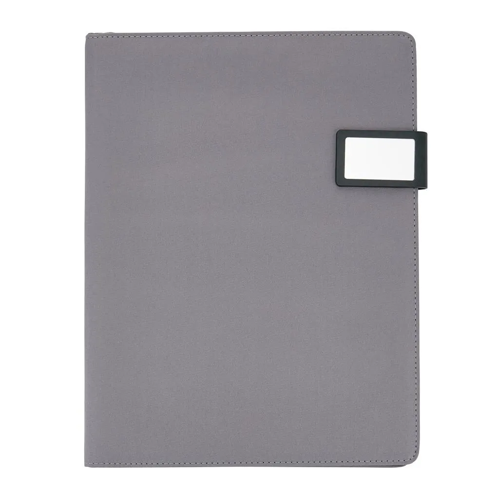 A4 tech portfolio with luxury magnetic metal closure. Inside: a tablet/phone stand, phone holder with see-through window which allows you to view and access your device. Suitable for most common phones for example iPhone 6 & Samsung S6. With sleeve for documents, 2 card holders and pen loop. Including recycled A4 notepad.