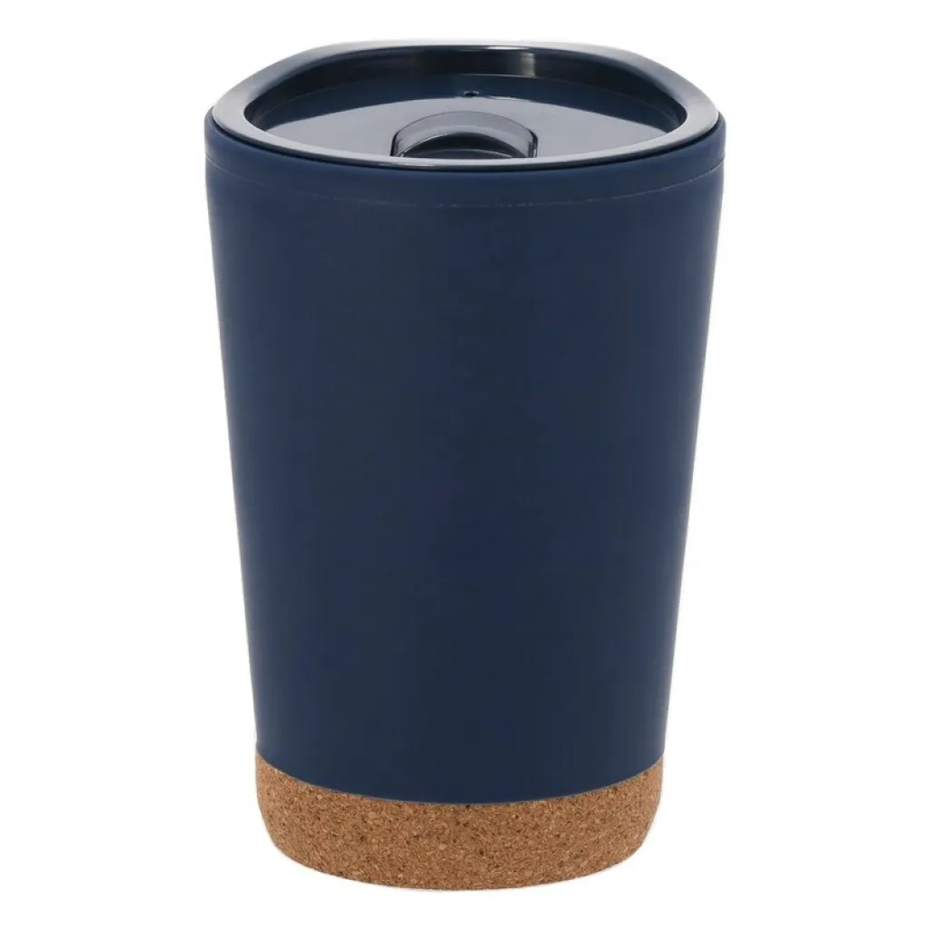 Thermo mug 260 ml with a lid and cork detail, features stainless steel double walls with vacuum insulation that slow down the release of temperature to the surroundings, functioning like a thermos, suitable for single hand operation, product made of recycled PP.