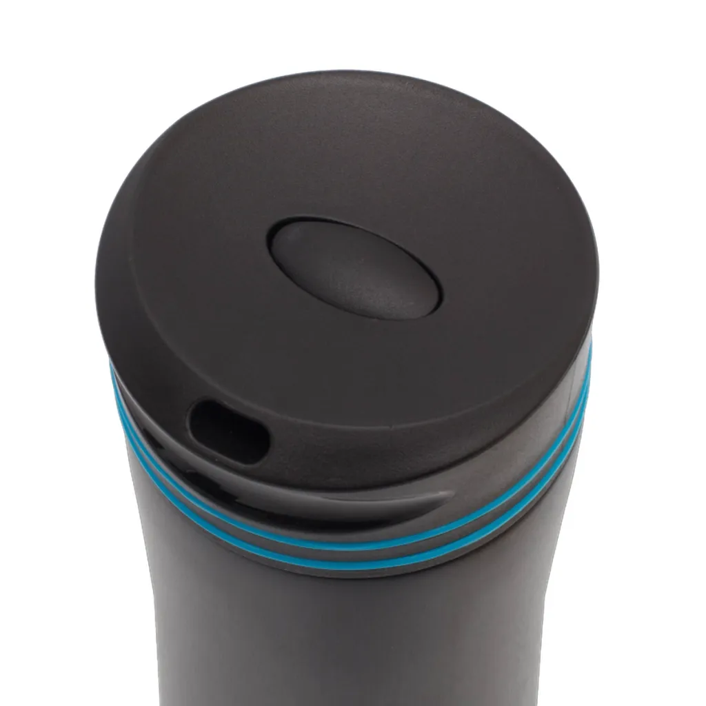 Thermocup 450 ml with 18/8 stainless steel interior and push button opening. Thermal insulation ability 14 h.
