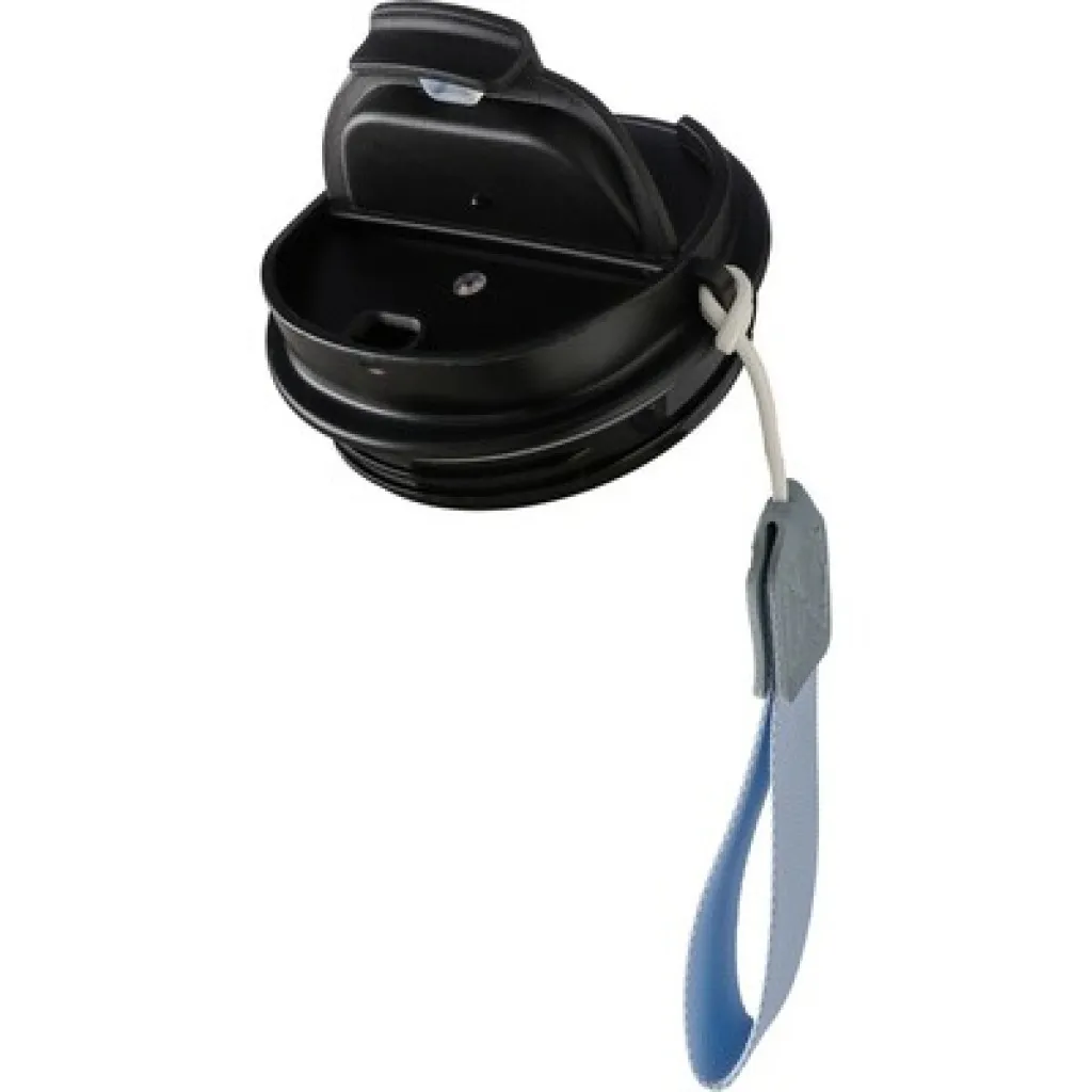 Thermo mug 500 ml features stainless steel double walls with vacuum insulation that slow down the release of temperature to the surroundings, functioning like a thermos, strap for more comfortable wearing or attaching, includes recycled stainless steel icon on the product, packed in brown carton box, product made from stainless steel, silicone, PP, PU, polyester