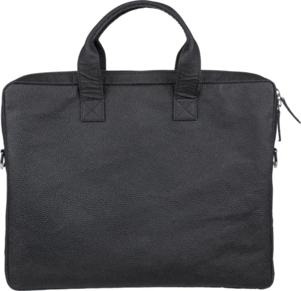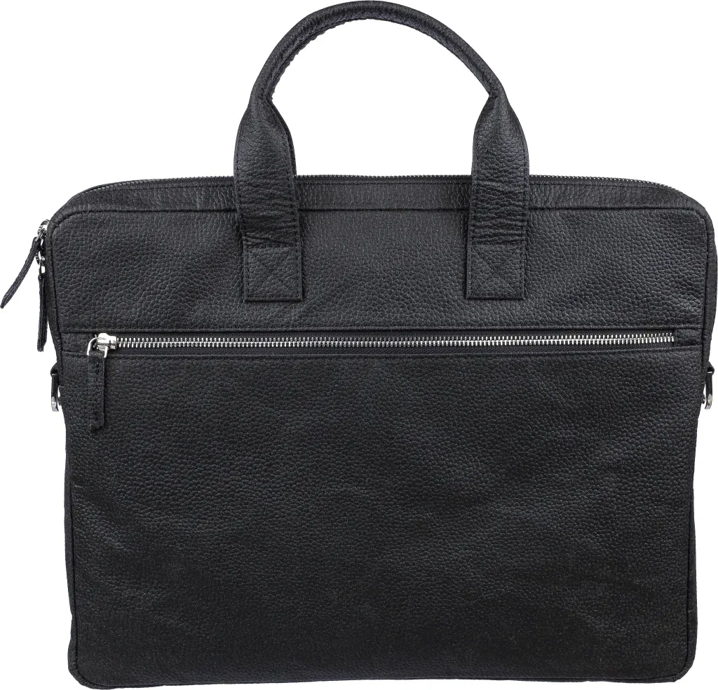 Tomato leather laptop (15 inch) bag with zippered compartments on the front and top, and a padded laptop pocket with Velcro closure. Multiple smaller pockets inside. With adjustable shoulder straps. Material composition: 50% cotton, 30% tomato, 20% biopolymer.