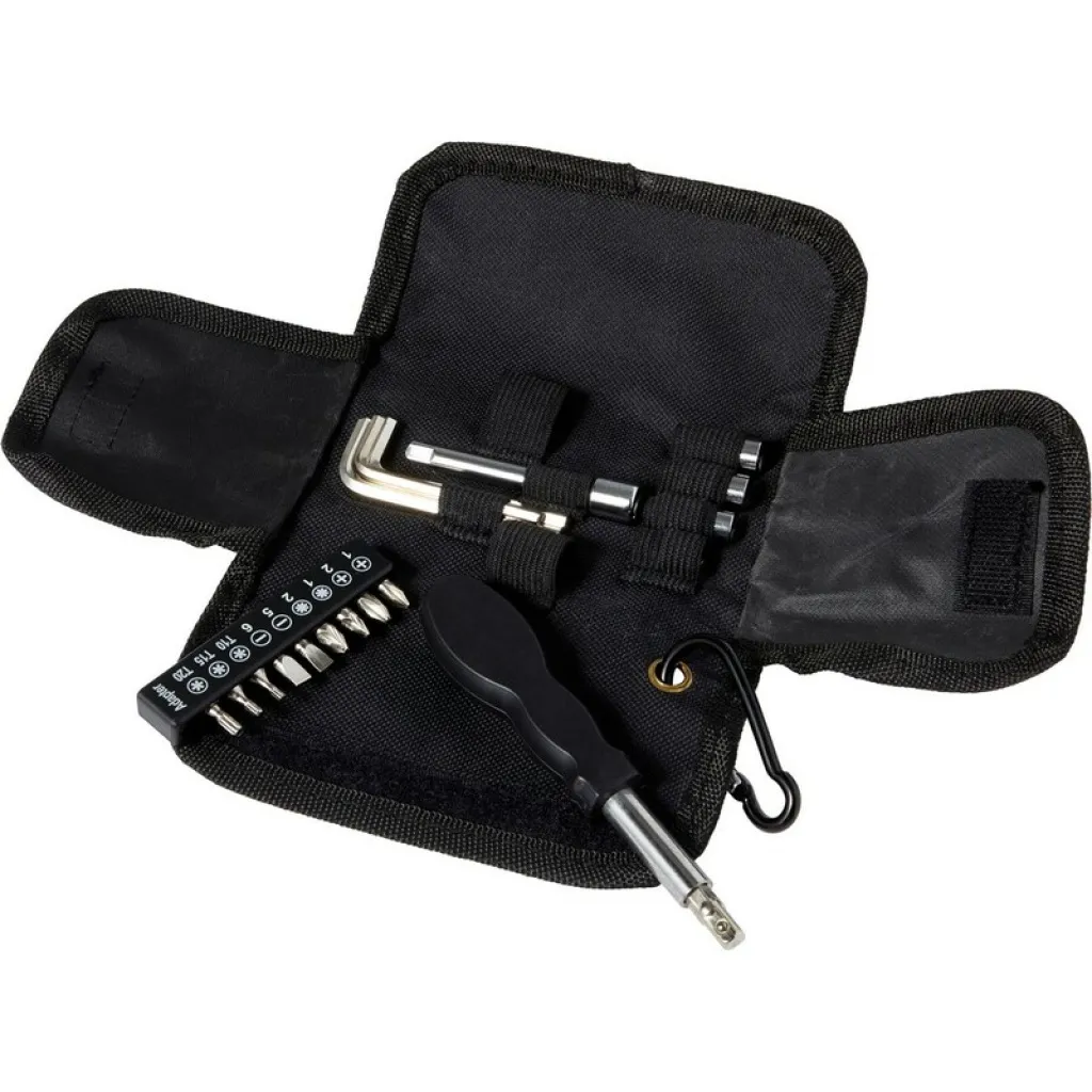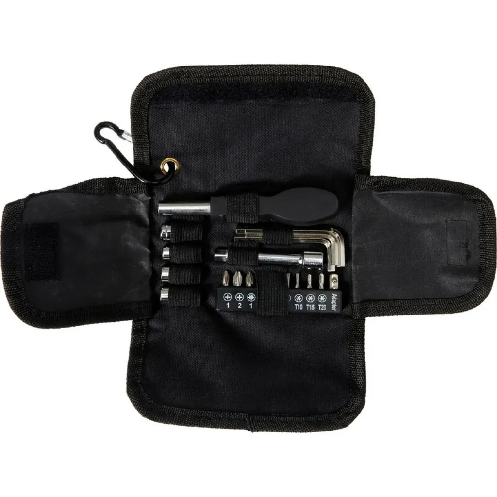 Tool set with 20 pcs including 1 screwdriver, 3 hex keys, 4 sockets, 10 bits, 1 tool bag, 1 prolong bar, in pouch with velcro and carabiner