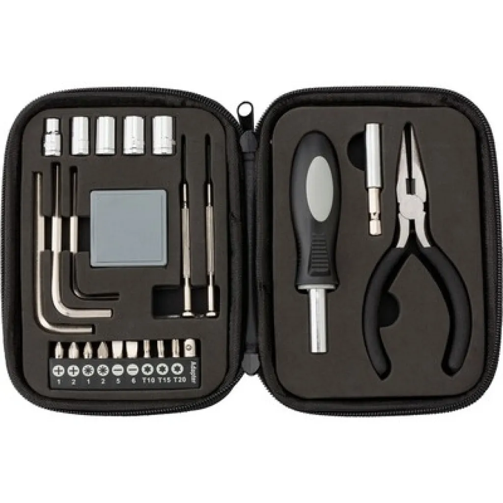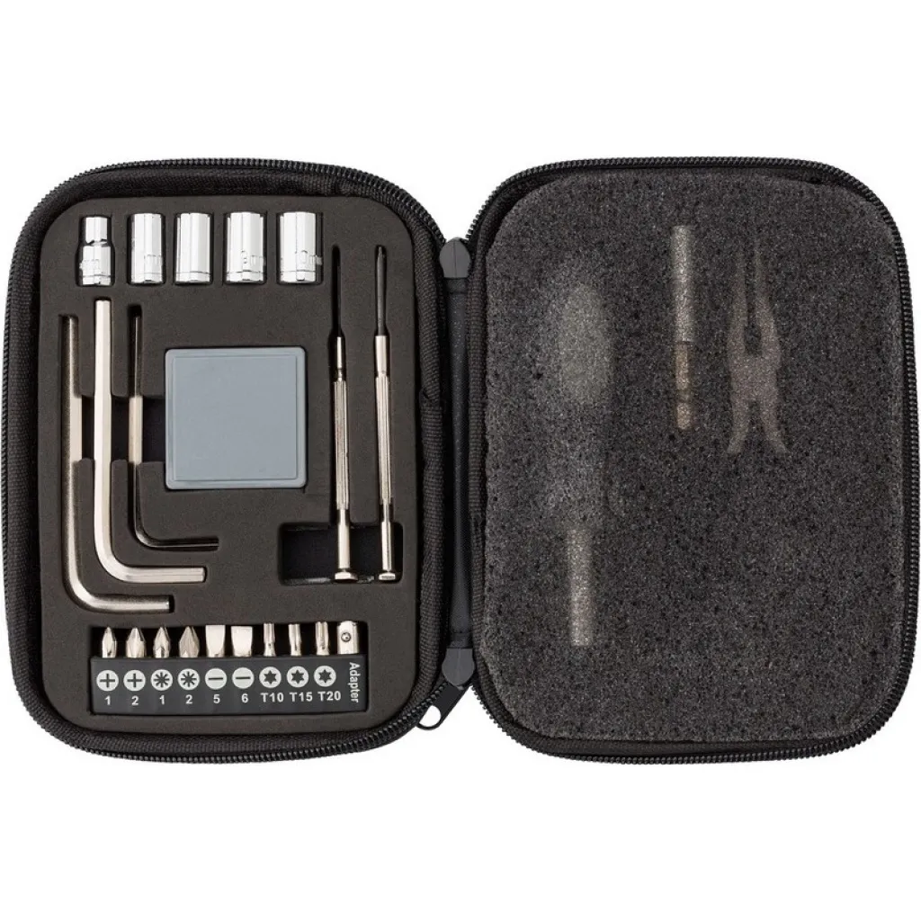 Tool set, 24 pcs: 5 sockets, 3 hexagonal screwdrivers, 9 screw bits, 1 socket, 1 measuring tape, 2 precision screwdrivers, 1 screwdriver handle, 1 extension bar, 1 set of pliers, in zipped leather case