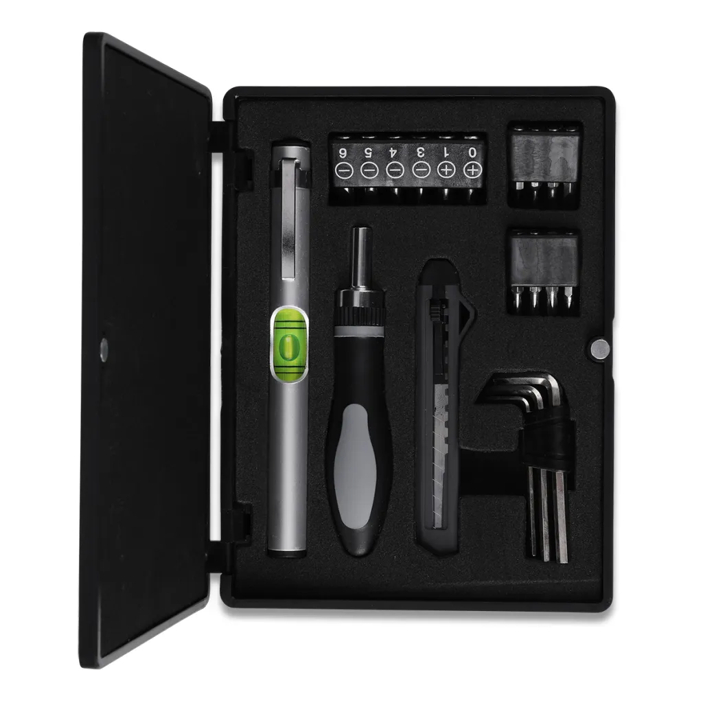 Tool set made of steel and plastic with 20 functions. Packed in a plastic case with magnetic closing.