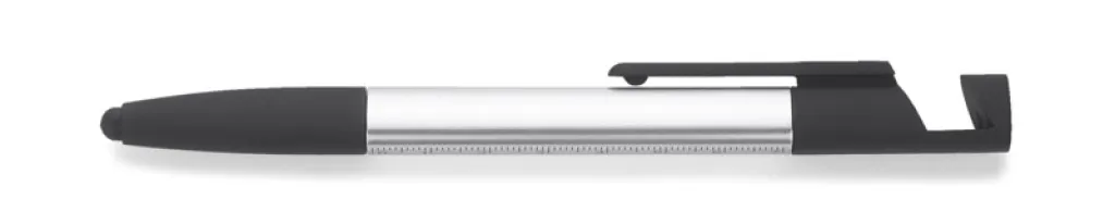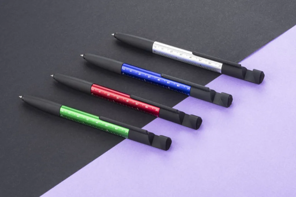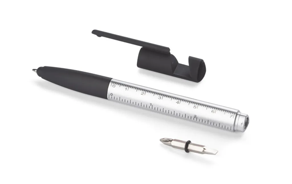 The practical SET in a small form covers as many as 8 functions: pen, touch screen tip, screen cleaner, phone stand, 2 screwdrivers, 2 rulers (inch and centimetre). It is made of plastic. Twist mechanism. X20 type blue refill.
