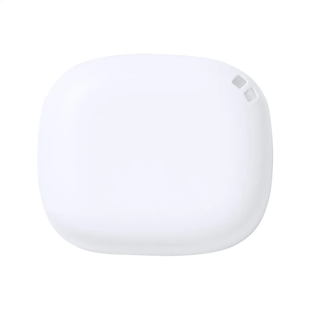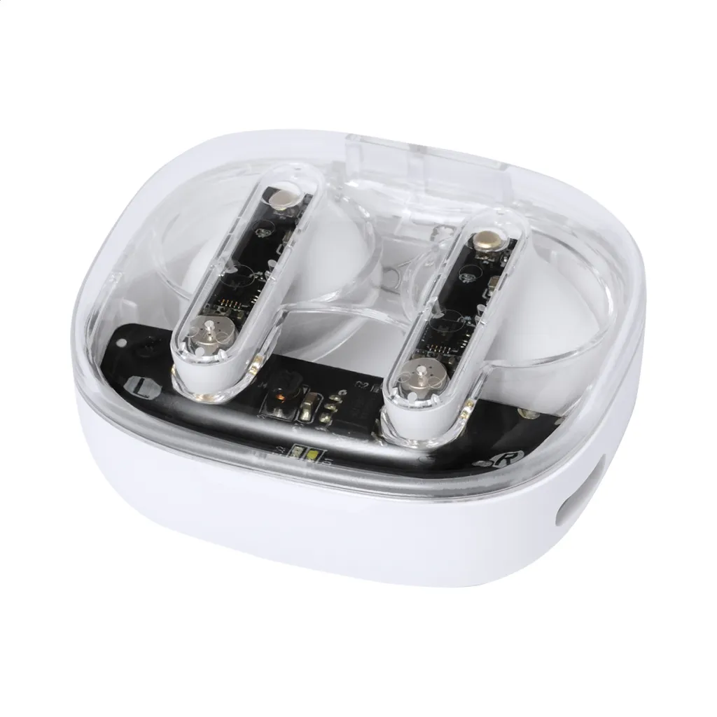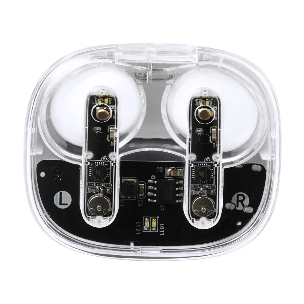 Semi-transparent, wireless bluetooth earphones with visible electronic components and hands-free call function. In semi-transparent plastic charger case. Including USB charger cable.