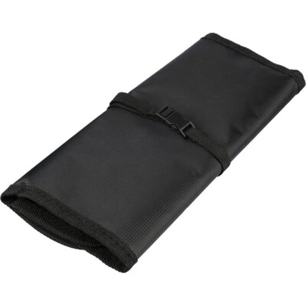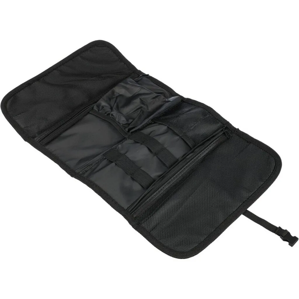Roll-up travel bag for storing cables and charging devices, buckle to keep the bag tight while traveling, various types of pockets inside, product made from polyester