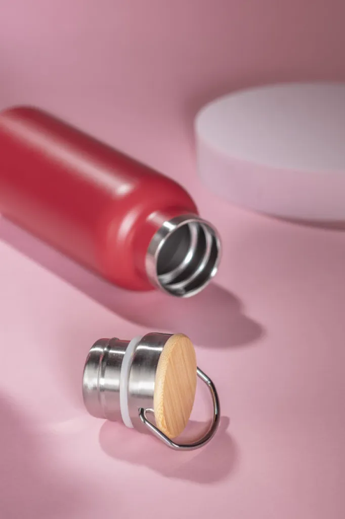 KAAN thermal bottle made of high-standard stainless steel. It has an interesting handle design and a cap with a bamboo finish. It has a vacuum between the walls, thanks to which it maintains the temperature of the drink for about 10 hours.