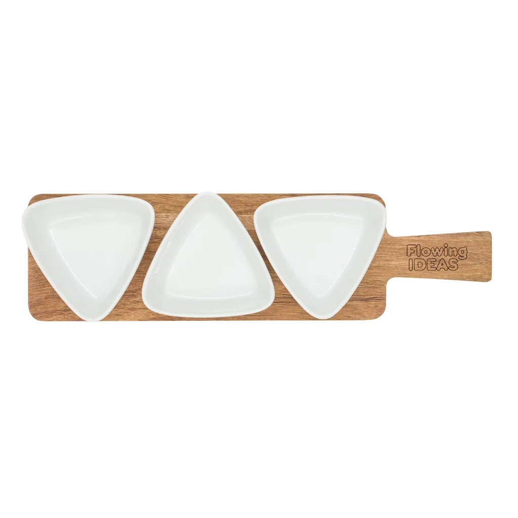 Serving set consisting of an acacia wood tray and 3 ceramic bowls for various snacks, side dishes or sauces.