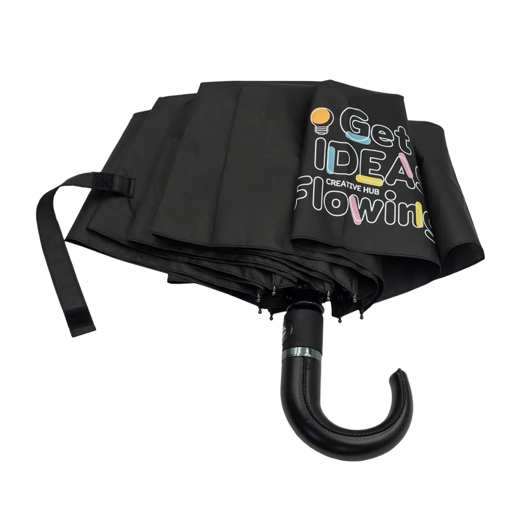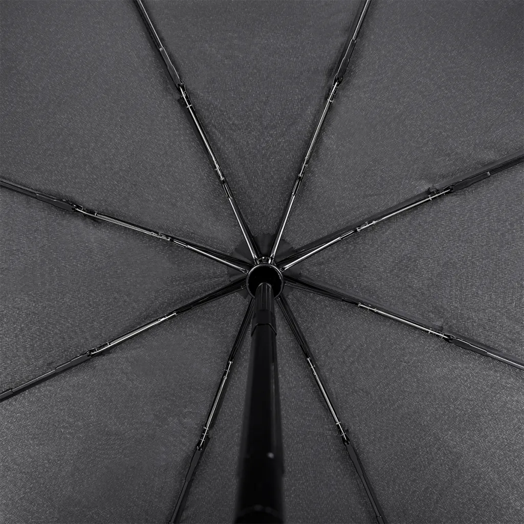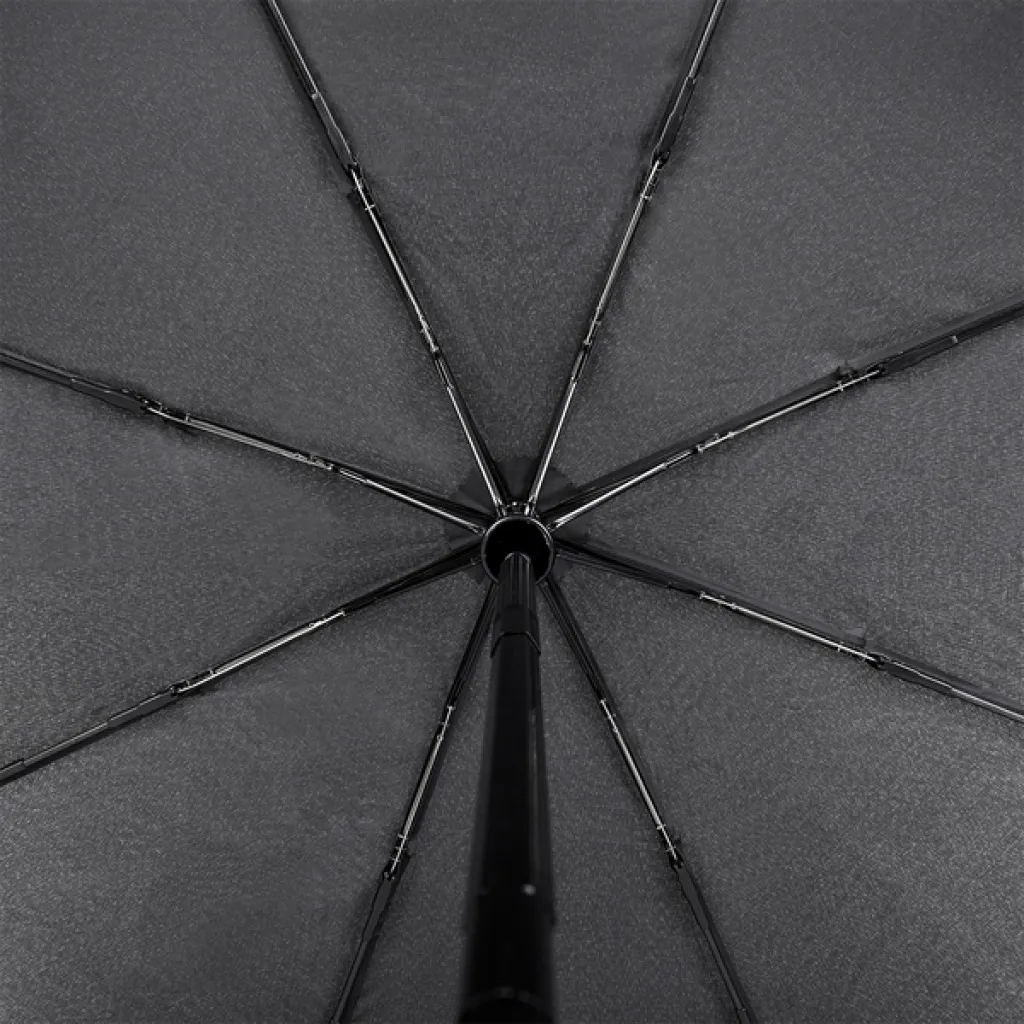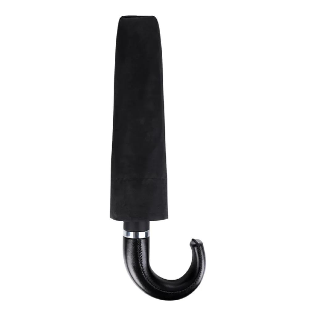 Automatic open/close umbrella. Fiberglass ribs, metal stick. Special rib construction makes it possible for the frame to be flipped inside out by the wind. Includes waterproof pongee pouch. Elegant, ergonomic eco-leather handle.