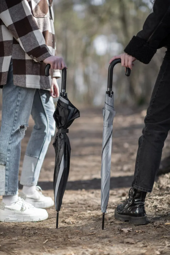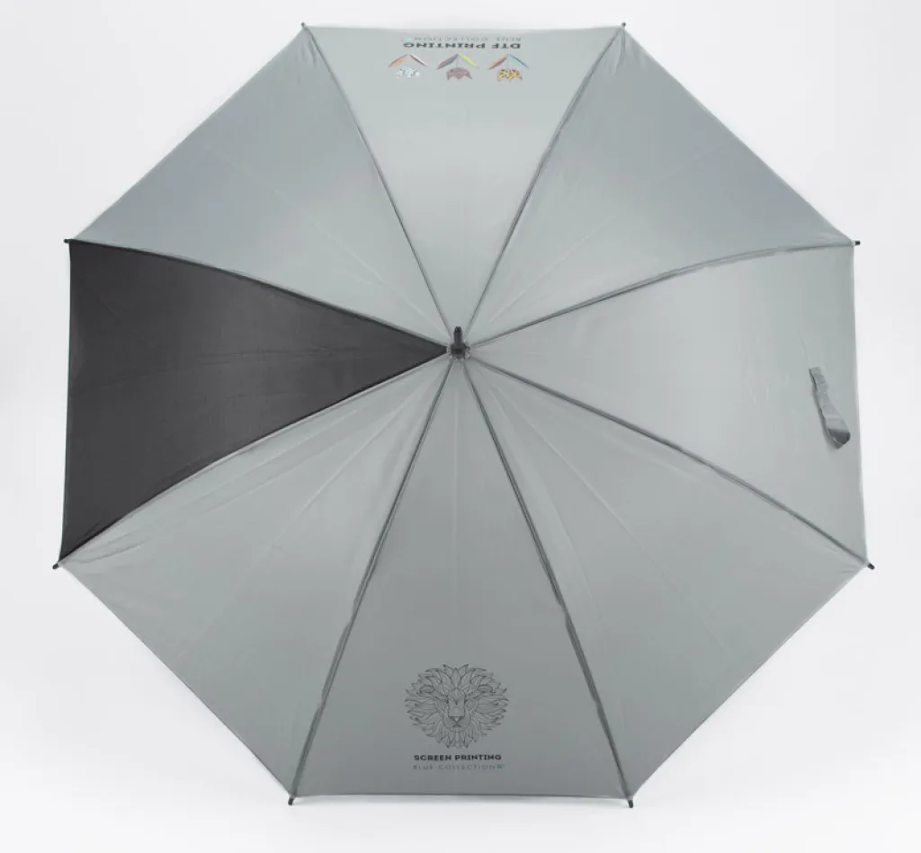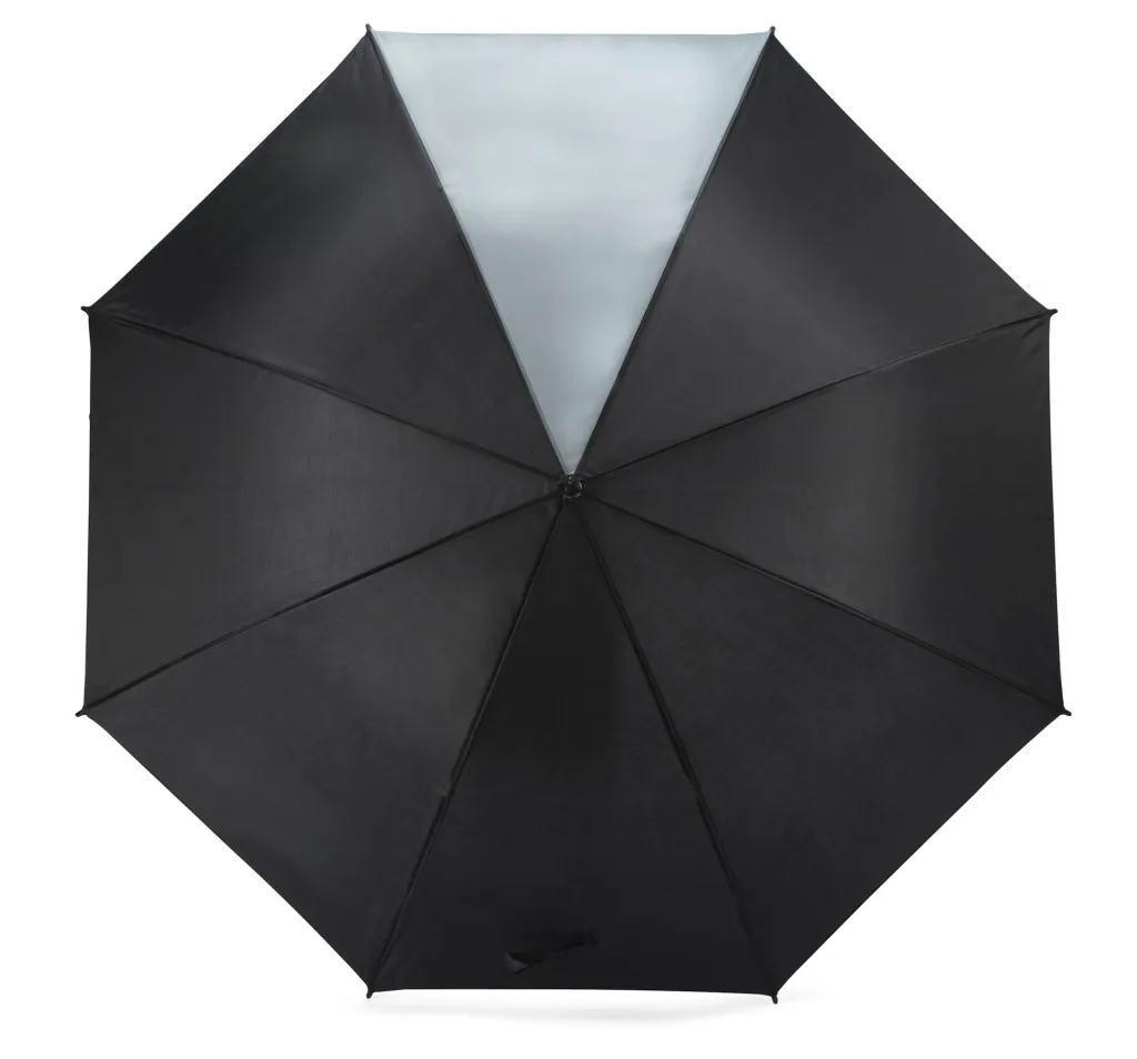 The LIF automatic Umbrella has a curved faux leather handle with elegant stitching. It is made of 190T polyester. One of the eight panels is in a distinctive color. The diameter of the bowl is 104 cm. The length of the folded umbrella is 88 cm.