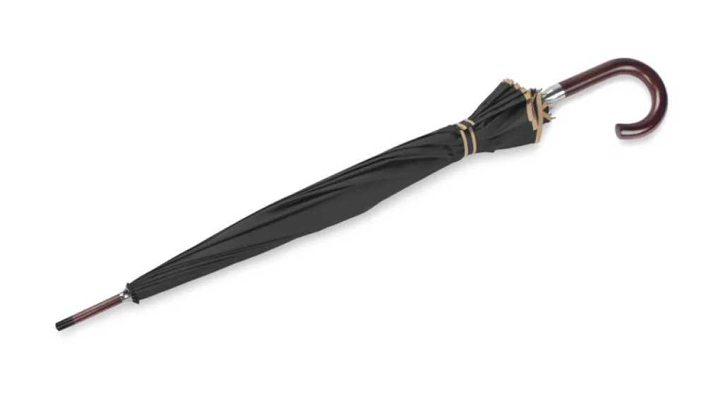 Very elegant manual umbrella, with 16 panels, ended with curved wooden handle. Its diameter when unfolded is equal to 112 cm, total length after folding is 90 cm. One panel width is 22 cm. Logo might be silk-screen imprinted.